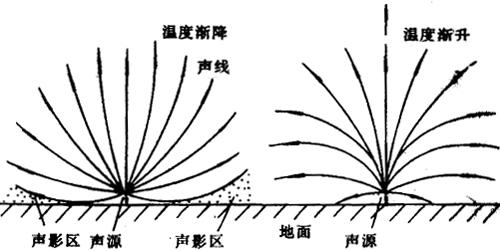 释义 | 大气中的声折射 大气虽然是声波的同一种媒质,但由于受温度和风的影响,各处特性会有不同。将引起声折射,现分别讨论如下: (1)因风速引起: 人们日常会感觉到,当刮风较大时,在地面上顺风听声音要比逆风容易。 刮风时由于地面上万物的摩擦阻力,接近地面的风力逐渐降低,这样会破坏波阵面。假定靠近地面有一声源,在无风时它的波阵面为系列的同心球面。如〔11.2-1a〕所示。但刮风时,波形上端的移动要比低处的快,因此波阵面不再为圆球,而是如(b)所示那样受到了破坏。由于波阵面上任何一点的传播方向皆垂直于波阵面,故有风时顺风的声线的方向朝下弯曲,而逆风时的声线方向朝上弯曲。因此在地面上,声源的听者要比右方向的方便。右方的有时甚至根本听不到。 图11.2-1 大气中的声波(a)无风时,(b)有风时 (2)因温度引起: 由于上述声速对温度的依赖关系。暖和空气中的声波传播,要快于较冷的空气。这种不均匀性也会引起大气中声波的折射。夏天的下午,地面的空气要比上空高,因而往往会出现比较宁静的环境。在图11.2-2中令AA代表某一时刻由声源S发出的声波的波阵面,过一定的时刻以后近地面的P点所传播的距离x,要大于上空的Q点所传播的距离y,在AA上的其它点上所传播的距离连续地界乎这两者之间,若以P、Q及它们中间的其它点为中心,以x及y和它们中间其它距离为半径作圆弧,然后画出这些圆弧的包络面即为这一时刻声源S的波阵面,图中以B曲线代表。可以看出它已经向右倾斜,故其方向已发生变化,它不再平行地面传播。再过一时刻,同样可得出波阵面C。它倾斜的更多,因此,这种情况下声音就向上传播至高空中。在L位置(也可以在声源边侧)的听者就不大听得到了。如果这作为正的温度梯度的话,那么对于负的温度梯度,即近地面的空气比较凉时,情况就恰恰相反。它对应于夏天傍晚时的情形,这时波阵面的倾斜是使声音朝向地面传播。因此我们会感受到地面的听音条件夏日傍晚要比正午时良好一些。图11.2-3是表示这两种情况下的声音折射的简图。必须指出,实际上大气的折射要比刚才介绍的要复杂得多。因为不同的折射媒质之间的分界线并不是直线。此外,风速和温度变化的影响往往会同时存在。增加传播现象的复杂性。 图11.2-2 温度对大气中声波的影响 图11.2-3 温度对声音传播方向的影响 【参考文献】: [1]IEC—327,Precision method for pressure calibration or one—inch standard condenser microphones by the reciprocity technique. 1971. [2]1EC—486,Precision method for free—field calibration of one inch standard condenser microphones by reciprocity technique, 1974. [3]IEC—150.Testing and calibration of ultrasonic therapeutic equipment, 1963. [4]GB 3223-82,水声换能器的自由场互易校准 [5]GB 3785-83,声级计的电,声性能及测量方法 [6]GB 7341-87,听力计 [7]GB 7614-87,校准测听耳机用宽频带型仿真耳 [8]GB 7342-87,测听耳机校准用IEC临时参考耦合腔 [9]OIML R102,声校准器 [10]JJG 188-90,声级计 [11]JJG 698-90,积分声级计 [12]标准电容传声器有关国家标准及检定规程 [13]JJG 388-85,听力计 |