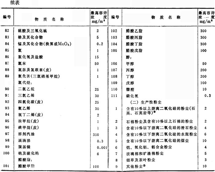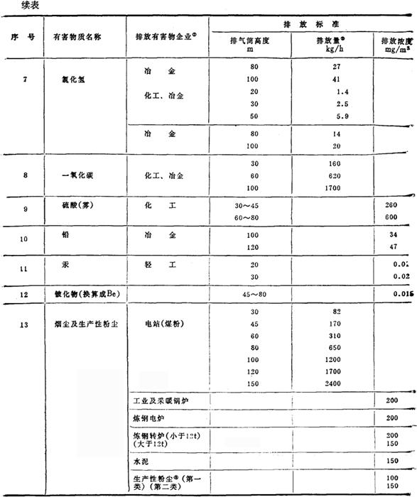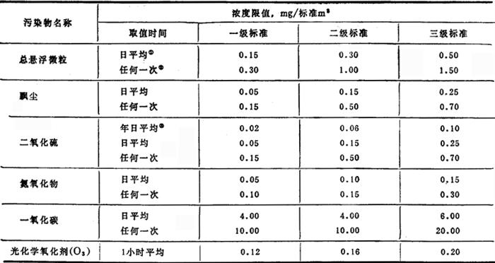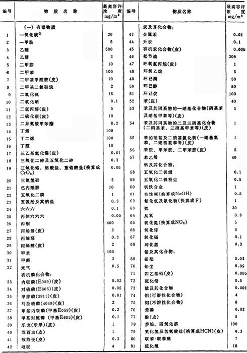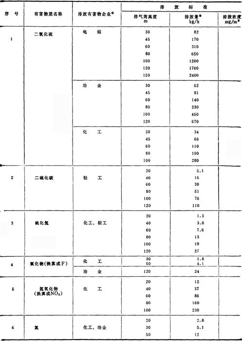 释义 | 大气环境质量标准 1.大气环境质量标准分为三级: 一级标准 为保护自然生态和人群健康,在长期接触情况下,不发生任何危害影响的空气质量要求。 二级标准 为保护人群健康和城市、乡村动植物,在长期和短期接触情况下,不发生伤害的空气质量要求。 三级标准 为保护人群不发生急、慢性中毒和城市一般动植物(敏感者除外)正常生长的空气质量要求。 空气污染三级标准浓度限值列于表3-7-11。 表3-7-11 空气污染物三级标准浓度限值 注:本表摘自《大气环境质量标准》(GB3095-82)。 ①为任何一日的平均浓度不许超过的限值。 ②为任何一次采样测定不许超过的浓度限值。不同污染物“任何一次”采样时间见有关规定。 ③为任何一年的日平浓度均值不许超过的限值。 2.居住区大气中有害物质最高容许浓度见表3-7-12。 表3-7-12 居住区大气中有害物质的最高容许浓度 注:(1)一次最高容许浓度,指任何一次测定结果的最大容许值。 (2)日平均最高容许浓度,指任何一天的平均浓度的最大容许值。 (3)本表所列各项有害物质的检验方法,应按现行的《大气监测检验方法》执行。 (4)灰尘自然沉降量,可在当地清洁区实测数值的基础上增加3~5t/km2·月。 (5)本表摘自《工业企业设计卫生标准》(TJ36-79)第4页表1。 3.车间空气中有害物质最高容许浓度见表3-7-13。 表3-7-13 车间空气中有害物质的最高容许浓度 注:1.表中最高容许农度,是工人工作地点空气中有害物质所不应超过的数值。工作地点系指工人为观察和管理生产过程而经常或定时停留的地点,如生产操作在车间内许多不同地点进行,则整个车间均算为工作地点。 2.有(皮)标记者为除经呼吸道吸收外,尚易经皮肤吸收的有毒物质。 3.工人在车间内停留的时间短暂,经采取措施仍不能达到上表规定的浓度时,可与省、市、自治区卫生主管部门协商解决。 4.本表所列各项有毒物质的检验方法,应按现行的《车间空气监测检验方法》执行。 5.本表摘自《工业企业设计卫生标准》(TJ36-79)第11页表4。 ①一氧化碳的最高容许浓度在作业时间短暂时可予放宽:作业时间1h以内,一氧化碳浓度可达到50mg/m3;半小时以内可达到100mg/m3;15~20min可达到200mg/m3,在上述条件下反复作业时,两次作业之间须间隔2h以上。 ②含有80%以上游离二氧化硅的生产性粉尘,宜不超过1mg/m3。 ③其他粉尘系指游离二氧化硅含量在10%以下,不含有毒物质的矿物性和动植物性粉尘。 4.废气排出口有害物质的排放量(或浓度),不得超过表3-7-14的规定。 表3-7-14 十三类有害物质的排放标准 注:本表摘自《工业“三废”排放试行标准》(GBJ4-73)第4页表i。 ①表中未列入的企业,其有害物质的排放量可参照本表类似企业。 ②表中所列数据按平原地区,大气为中性状态,点源连续排放制订,间断排放者,若每天多次排放,其排放量按表中规定:若每天排放一次而又小于1h,则二氧化硫、烟尘及生产粉尘、二硫化碳、氟化物、氯、氯化钠、一氧化碳等7类物质的排放量可为表中规定量的3倍。 ③系指局部通风除尘后所允许的排放浓度。第一类指:含10%以上的游离二氧化硅或石棉的粉尘、玻璃棉和矿渣棉粉尘、铝化物粉尘等;第二类指:含10%以下的游离二氧化硅的煤尘及其他粉尘。 |