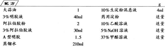 释义 | 大蒜挥发油微型胶囊配方 制法 (1)配制胶液 称取阿拉伯胶1.5g,加水50ml,冷浸片刻,置70℃左右水浴中,不断搅拌,使之溶解,用棉花过滤,备用。另称取A型明胶1.5g,加水10ml,冷浸片刻,置70℃左右水浴中,不断搅拌,使之溶解,用棉花过滤,备用。 (2)乳化 取阿拉伯胶粉0.5g置于研钵中,加大蒜油1g,研磨均匀,再加蒸馏水1ml,迅速研磨,制成初乳,并以3%阿拉伯胶液30ml稀释成乳剂。 (3)包囊 将大蒜油乳剂转移至250ml烧杯中,置于磁力加热搅拌器上,边加热边搅拌,待温度升至45℃时,缓缓加入3%A型明胶液(预热至45℃)40ml,使胶温度保持在43~45℃,继续搅拌,并用10%乙酸溶液调pH至4.1~4.3,显微镜下可观察到乳粒外包有凝聚的膜层。 (4)稀释、冻凝 于上述凝取囊液中,加入较其温度稍低之蒸馏水150ml,继续搅拌,显微观察,微囊形态较前更为圆整,呈球状,俟温度降至30℃以下时,移至冰水浴,冻凝。 (5)固化 于上述微囊液中加入1ml37%的甲醛溶液,继续搅拌20min,使微囊固化定型,然后用5%NaOH调节其pH值为7.0~7.5,使凝胶的网状结构孔隙缩小。再搅拌30min。 (6)分散 继续搅拌20min后,加入10%淀粉混悬液4ml,使淀粉充分散开,在微囊间形成一隔离层,10℃左右再搅拌1h。 (7)干燥 将上述制成的微囊,吸滤分离洗涤,尽量除去水分,以20目筛制颗粒。颗粒中可加入适量干燥淀粉调整,使其松散,于60℃干燥即得微囊颗粒。 配方中,大蒜油主要成分为大蒜辣素、大蒜新素(二烯丙基化三硫)等多种烯丙基、丙基和甲基组成的硫醚化合物,系挥发性植物杀菌素,目前已广泛应用于临床。 |