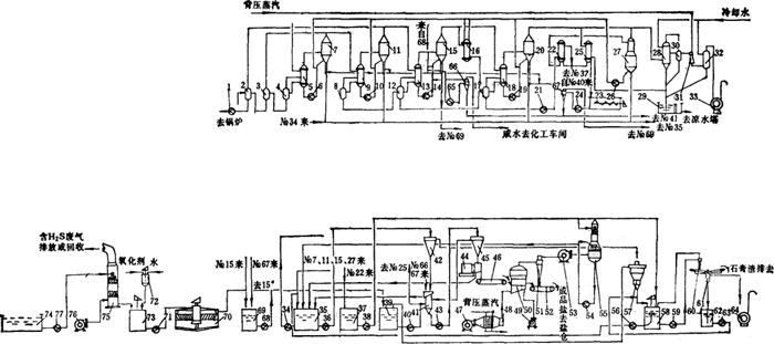 释义 | 天然卤水分段蒸发制盐工艺流程 (一)工艺流程图例 见图3-4-18。 图3-4-18 天然卤水分段蒸发制盐工艺流程图 1、19、21、24、26、34、36、38、40、43、54、56、59、63、65、68、71、77-工艺泵 2、3、4、8、12、17-冷凝水桶 5、9、13、18-加热室 6、10、14、19-循环泵 7、11、15、20-蒸发罐 16、22、25-预热器 23-盐浆槽 27-脱氧器 28-混合冷凝器 29-加水坑 30-汽水分离器 31-蒸喷泵 32-冷凝器 33、64-液环真空泵 66、67-盐浆旋流器 35、37、39、69-储桶 41-洗盐器 42-沉盐器 44-离心机 45-盐浆高位槽 46-湿盐输出带 47、49、53、76-风机 48-空气加热器 50-沸腾干燥器 51-干式收尘器 52-干盐输送带 55-湿式除尘器 57、70-沉清桶 58-转晶桶 60-加料器 61-过滤机 62-滤液桶 72-配药桶 73-反应桶 74-卤池 75-吹出塔 (二)流程特点 1.原卤经过空气吹出、化学氧化两级处理,脱除H2S,残存H2S含量<2mg/L。 2.多级预热,真空脱氧,预热温度65~70℃。 3.石膏晶种法防垢。 4.四效蒸发,并流进料,分效排盐以维持罐内石膏晶种量。罐内料液浓度分成二段浓度梯度,保证抽咸浓度。 5.盐脚淘洗,减少咸卤的带失。 (三)流程适用范围 1.原卤中含有H2S的卤水,H2S的含量幅度为60~600mg/L。 2.原卤中富含K+、Br-、I-、H3BO3等化工原料,需提取利用。 3.卤水中含CaSO4约为1.5g/L,在浓缩过程中会析出结垢。 4.卤水中NaCl含量180~200g/L,尚未达到饱和。 5.伴随蒸发浓缩,料液酸度会增大。 (四)主要技术经济指标 1.盐质:NaCl含量≥98.5% 2.卤耗:11~12.5标m3/t盐 3.咸水量:50~60kg/t盐,其中有用化工原料收回率≥85% 4.蒸发热经济:2.6~2.8kg水/kg蒸汽 |