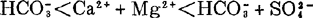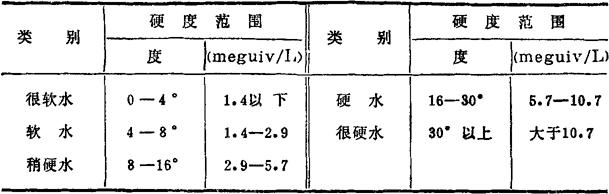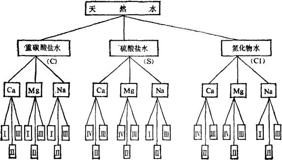 释义 | 天然水的分类 一、阿列金分类法 根据阴、阳离子当量数的多少,进行分类. 首先,根据阴离子当量数的多少,把天然水分为三类: 重碳酸盐水 (C) 硫酸盐水 (S) 氯化物水 Cl-的当量数> (CI) 其次,根据阳离子当量数的多少,又把每一类水分为三组 钙质组(Ca) Ca2+的当量数> 镁质组(Mg) Mg2+的当量数> 钠质组(Na) Na+的当量数> 最后,再根据阴、阳离子当量数的相互关系,在每一组中又分型,共有以下四种型: Ⅰ型 Ⅱ型 Ⅲ型 Ⅳ型 上述阿列金分类法,以图2-1表示。 表2-1 天然水硬度分类表 图2-1 天然水分类的示意图 本分类采用符号来表示;类由相应的阴离子名称中的符号(C,S,C1)来表示;组用化学成分的符号来表示;型用罗马字来表示。例如,重碳酸盐类,钙组,第二型,则表示为 二、根据硬度对天然水的分类 三、根据BOD对河水的分类 表2-2 根据BOD对河水的分类表 四、根据矿化度对淡水的分类 表2-3 根据矿化度对淡水的分类表 (编者:李三庆 审者:雷衍之、黄仿元) |