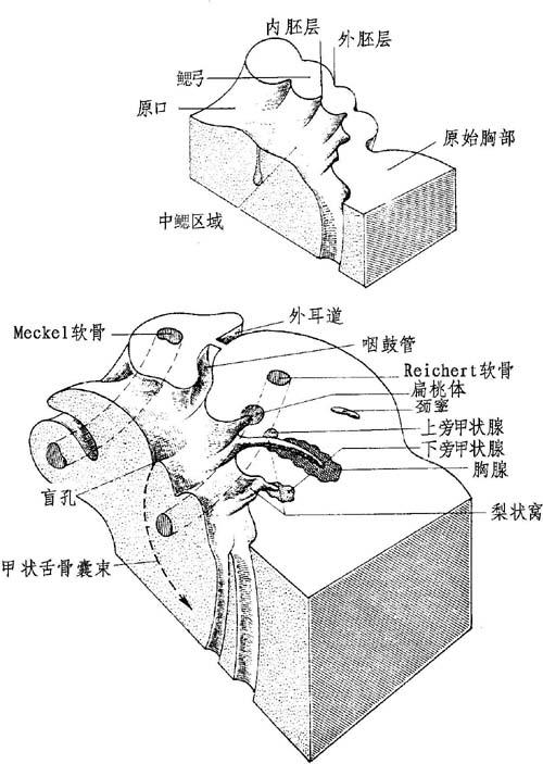 释义 | 头原盖的器官发生 神经管发育很明显,尤其是在背部伸入头部形成一非常重要的项曲(近90°)。紧接着形成的颈部将使颈曲变直(颈部的形成)。 头胚和咽肠:①上方:发出一个背部憩室,位于口咽膜稍后方,叫Rathke囊(腺垂体);②外方:摊成鳃器官内面的平板;③下方:盖过中鳃腺部分(舌和甲状腺体)。 头部的中胚层与器官的残余相反,除了第三或第四头颅体节外,未分化成体节。 此头部中胚层将组成①向前上方:颅索、眼外肌;②向外方:鳃器官;③向下方:中鳃部分;④向前和向下:面芽基。 头体节将发育成①向前成为颅骨的组成部分;②向后成为前几个颈椎骨。 肌形成成分,其在中鳃腺部分移行以便形成舌肌。此等移行偕同大舌下腺神经一并进行。 外胚层在一定的地方逐渐增厚以便形成感官基板,神经感官将同神经管延长部分更早发生联系。 脊索原基完全消失后便混入脊椎骨和蝶颅骨中。这些残余的脊索原基可能成为恶性肿瘤或脊索瘤(属嗜酸性细胞类)。此等肿瘤有时发生在蝶颅部(鼻咽腔)或发生在骶尾部。 一、软骨颅和感官包囊(图1-1) 图1-1 软骨颅 头端中胚层集聚到脊索周围并形成基底板。 1 .后部相当于将形成颅孔的前缘并混入到颅原始体节中。 2.前部伸展到垂体部,后者为Rathke囊咽外突通过的小孔所在地。 基底板继续向软骨转化并向各感觉原始嗅板、视神经板及听板等方向不断延伸。 此等软骨基底板延伸部分组成周围感觉性嗅、视及听囊。 3 .到第2个月时共同完成脊索颅的阶段。 脊索颅将骨化成①基底板:颅骨体和蝶骨体;②视囊:眼眶的一部分;③嗅或鼻囊:二者好似一个下凹面沟粘合在一起,位于中线上。 外侧:①上后部:筛骨外侧部分。②下前部:除翼软骨部分外,将自行吸收。③下部:单独游离出鼻下甲并各自形成。 中板:①向前方:筛骨垂直板和鼻中隔软骨。②向后方:自行吸收并代之以犁骨、黏膜骨。 听囊:①迷路骨;②岩骨;③乳突。 脊索颅构成中胚层和某些骨的中间阶段,此等骨就是所指的内软骨来源。 颅部其他骨质直接来源于中胚层,为黏膜骨,包括:①枕骨鳞部;②蝶骨大翼和蝶骨翼突;③颞骨鼓部和鳞部;④颅顶骨。 同时全体面骨也属此等黏膜骨组织。 二、鳃器官(图1-2) 图1-2 鳃装置-鳃囊 在形态学上为所有脊椎动物的共同成分,在鱼类为一直保持着的呼吸器官,而人类胚胎期短暂全无同样意义。 鳃在人类出现得很早(第四周)。 ①在头顶端之外侧壁;②呈外胚和内胚压迹的一部分,和呈背腹隆起且在颅尾感觉中编成1至6号。 压迹叫鳃囊或鳃沟。这些外、内胚层之鳃囊由一薄内胚层将其分开成两个小叶。此三组织相依组成闭锁膜。在鱼类,此闭锁膜在某些部位消失并造成永久性真正裂隙。在人类,与鱼类相比,相应的外、内胚层囊一起统称之为鳃裂。通常,人类实际上并无此裂存在,原因是:①或有闭锁膜永远残留;②或为膜吸收后留下一个毗连的弓(二连弓)。 尚有:①外胚层的四个囊;②内胚层的六个囊,但其第五、六囊只是简单的沟。 鳃弓是些沟裂,分隔各鳃裂。第2鳃弓,位于第一和第二裂之间,发育最好。每个弓的中胚层都有:①混和颅神经;②由腹主动脉球发出之动脉支引向背主动脉;③肌原基;④软骨骨原基,在两个第一弓处特别清楚:Meckel软骨为第一个弓,Reichert软骨为第二个弓。 |