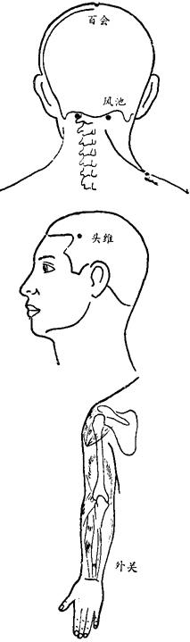 释义 | 头痛 【取穴】 百会:两耳尖直上,头顶正中点(图224)。 图224 头痛 风池:乳突后约1.5寸处,凹陷中。 头维:额角发际后5分。 外关:腕背侧横纹正中上2寸。 【配穴方法】 (一)风池(-)双,百会(+)。 (二)风池(-)双,外关(+)单。 (三)头维(-)双,百会(+)。 【治疗】频率由中到慢,电压适量,通电时间15~20分钟。 |