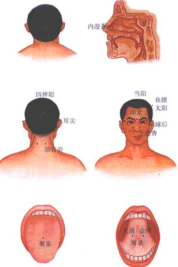 释义 | 头颈部经外穴 四神聪Sìshéncōng(EX-HN 1) 【定位】 在头顶部,当百会前、后、左、右各1寸,共四穴。 【主治】 头痛,眩晕,失眠,健忘,癫癎。 【操作】 平刺0.5~0.8寸。 当阳Dāngyáng(EX-HN 2) 【定位】 在头前部,当瞳孔直上,前发际上1寸。 【主治】 眼急痛不可远视,头痛,眩晕。 【操作】 平刺0.5~0.8寸。 印堂Yìntáng(EX-HN 3) 【定位】 在额部,当两眉头中间。 【主治】 头痛,眩晕,鼻衄,鼻渊,眉棱骨痛,小儿惊风,失眠。 【操作】 平刺0.3~0.5寸。 鱼腰Yúyāo(EX-HN 4) 【定位】 在额部,瞳孔直上,眉毛中。 【主治】 眉棱骨痛,眼睑瞤动,眼睑下垂,目赤肿痛,目翳。 【操作】 平刺0.3~0.5寸。 太阳Tàiyáng(EX-HN 5) 【定位】 在颞部,当眉梢与目外眦之间,向后约一横指的凹陷处。 【主治】 头痛,目疾,齿痛。 【操作】 直刺或斜刺0.3~0.5寸,或用三棱针点刺出血。 耳尖 【定位】 在耳廓的上方,当折耳向前,耳廓上方的尖端处。 【主治】 目赤肿痛,目翳,偏正头痛,喉痹,麦粒肿。 【操作】 直刺0.1~0.2寸,或用三棱针点刺出血。 球后Qiúhòu(EX-HN 7) 【定位】 在面部,当眶下缘外1/4与内3/4的交界处。 【主治】 目疾。 【操作】 轻压眼球向上,向眶缘缓慢直刺0.5~1.5寸,不提插。 上迎香Shàngyíngxiāng(EX-HN 8) 【定位】 在面部,当鼻翼软骨与鼻甲的交界处,近鼻唇沟上端处。 【主治】 头痛,鼻塞,暴发火眼,迎风流泪。 【操作】 向内上方平刺0.3~0.5寸。 内迎香Nèiyíngxiāng(EX-HN 9) 【定位】 在鼻孔内,当鼻翼软骨与鼻甲交界的粘膜处。 【主治】 目赤肿痛,鼻疾,喉痹,热病,中暑,眩晕。 【操作】 用三棱针点刺出血。 聚泉Jùquán(EX-HN 10) 【定位】 在口腔内,当舌背正中缝中点处。 【主治】 舌强,舌缓,消渴,哮喘,咳嗽,味觉减退。 【操作】 直刺0.1~0.2寸,或用三棱针点刺出血。 海泉Hǎiquán(EX-HN 11) 【定位】 在口腔内,当舌下系带中点处。 【主治】 消渴,舌肿,呃逆。 【操作】 用三棱针点刺出血。 金津,玉液Jīnjīn(EX-HN 12),Yùyè(EX-HN 13) 【定位】 在口腔内,金津当舌下系带左侧的静脉上,玉液当舌下系带右侧的静脉上。 【主治】 舌强不语,口疮,舌肿,呕吐,消渴。 【操作】 点刺出血。 翳明Yìmíng(EX-HN 14) 【定位】 在项部,当翳风后1寸。 【主治】 目疾,耳鸣,失眠,头痛。 【操作】 直刺0.5~1寸。 颈百劳Jǐngbǎiláo(EX-HN 15) 【定位】 在颈部,当大椎直上2寸,后正中线旁开1寸。 【主治】 骨蒸潮热,盗汗自汗,瘰疬,咳嗽气喘,颈项强直。 【操作】 直刺0.5~1寸。 |