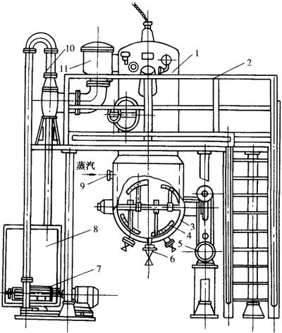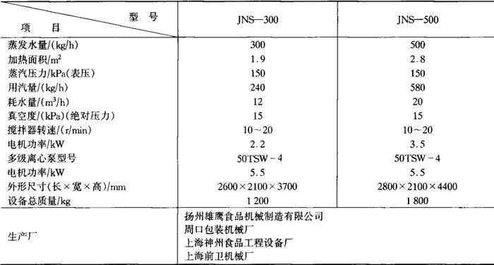 释义 | 夹套式搅拌真空浓缩锅 加热方式为带有搅拌设备的夹套加热锅。 (一)用途与特点 是一种食品厂大量采用的间歇操作、单效真空浓缩设备。加热蒸汽通入下锅体的夹套内加热被搅拌器不断搅拌的物料使其蒸发浓缩。适于较黏稠、易结晶物料的浓缩。设备结构简单、操作控制容易,物料受热均匀但加热面积小,生产能力低。 (二)结构与工作原理 夹套式搅拌真空浓缩锅由带搅拌装置的蒸发锅、汽液分离器、止回阀、水力喷射器、水箱、多级离心水泵、仪表箱和操作台等部件组成,见图4-8-5。除搅拌真空蒸发锅外,其他附属设备同盘管式真空浓缩锅。 图4-8-5 夹套式搅拌真空浓缩锅 1-上锅体 2-支架 3-下锅体 4-搅拌器 5-减速箱 6-进出料口 7-多级离心泵 8-水箱 9-蒸汽入口 10-水力喷射器 11-汽液分离器 搅拌真空蒸发锅由上、下锅体组成。下锅内有横轴式搅拌器装置,由电动机通过三角皮带和蜗轮蜗杆传动。水力喷射器工作产生的真空将物料吸入锅内,至要求容量后,开启搅拌器搅拌物料,开启蒸汽通过夹套加热,进行浓缩至所需浓度后,解除真空开底阀出料。 (三)主要技术参数 夹套式搅拌真空浓缩锅主要技术参数见表4-8-2。 表4-8-2 夹套式搅拌真空浓缩锅主要技术参数 |