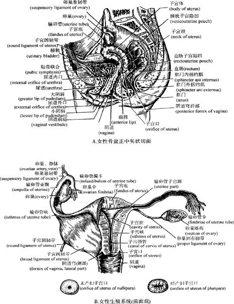 释义 | 女性生殖系统 女性生殖器也分内生殖器(female internal genital organs)和外生殖器(female external genital organs)。内生殖器包括卵巢、输卵管、子宫、阴道。它们均位于盆腔内(图14-11A、B)。 图14-11 女性生殖系统(A、B) |