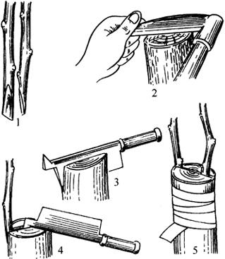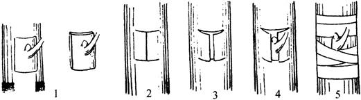释义 | 嫁接方法 生产上,苹果嫁接以芽接方法为主,枝接法为辅。一年中的春、夏、秋三季都可嫁接,但比较适合的时期为春、秋两季。春季可以采取带木质芽接、枝接和根接;秋季枝条离皮时可以进行丁字形芽接,枝条护皮时可采取带木质芽接法;夏季同秋季的嫁接方法相同。嫁接前3~4天应灌一次透水,以利于砧木的离皮,并喷药杀灭黄刺蛾,以便于嫁接。如果嫁接两个以上品种时,要根据品种数量、地块的划分,做好标记,以免使品种混乱。 1.芽接法 该方法应用广泛,嫁接效率高,可嫁接时间长,便于补接和大量繁殖。 (1)丁字形芽接法 又称T字形芽接和盾芽接(见图3-9)。该方法适用于各种果树,生产上应用也最广泛,尤其适合初学嫁接者。该方法可于夏、秋季节木质部与韧皮部之间形成离层时采用。 ①削芽片 既可采用“两刀法”(图3-9的削法)也可采取“三刀法”(图7-4)。“两刀法”的操作过程如下:在接芽上方0.5厘米处横切一刀,深达木质部,然后在接芽的下方1~1.5厘米处下刀,略倾斜向上推削至横切口处,然后将接芽轻轻取下。“三刀法”即:先在接芽上方0.5厘米处横切一刀,然后在接芽两侧各斜切一刀,用手捏住芽片,轻轻掰下即可。 图7-4 “三刀法”丁字形芽接 ②切砧木 在距离地面3~5厘米处选择光滑部位作为芽接部位。用刀切一T字形切口,深达木质部,横切口可略宽于芽片,纵切口应短于芽片。然后用刀撬开纵切口,将芽片顺T字形切口插入,芽片的上边对齐砧木的横切口,最后用塑料条从上向下绑紧包严,芽眼要露出。 (2)带木质部嵌芽接 当苹果接穗和砧木不易离皮时,可采用此法(见图3-12)。 ①削芽片 削取接芽时倒拿接穗,先在芽上方0.8~1.0厘米处向下斜削一刀,长约1.5厘米,略带木质。然后在芽的下方0.5~0.8厘米处呈30°角斜切到第一刀口底部,取下芽片。 ②切砧木 在距离地面3~5厘米处的光滑部位,按照芽片的大小,相应地在砧木上由上而下切一切口,长度应比芽片长。最后将芽片嵌入切口中,注意芽片与砧木至少一侧形成层(或皮层)对齐,以利愈合,用塑料条绑严,露出芽子。 (3)方块芽接法(图7-5) 图7-5 方块芽接 1.切割砧木 2.方块形接口 3.切取芽片 4.方块形芽片 5.绑扎 ①削芽片 将离皮的接芽呈方块形切下,上、下切口距接芽均为0.7~1.0厘米,两侧距芽0.3~0.5厘米左右,用手轻轻将芽取下。 ②切砧木 在欲嫁接处选光滑部位,切割一个同样大或稍大的芽片,将接芽贴在砧木的切口上,将四边(或至少一边)对齐。用塑料条绑紧包严。 (4)套芽接法 又称管状芽接法(图7-6)。该方法要求砧木与接芽筒的粗度相当。 图7-6 套芽接 1、2.拧下芽管 3.砧木扒皮 4.套芽管 5.绑扎 ①削芽片 用修枝剪在接芽上方0.7~1.0厘米处剪断,再用芽接刀在接芽下方0.7~1.0厘米环割一圈,深达木质部,然后将管状接芽轻轻拧出来。 ②切砧木 在欲嫁接处,选光滑部位用修枝剪剪断砧木,并用芽接刀沿剪口处向下纵切几刀,然后顺切口将砧木皮层扒开,将接芽筒套入。将砧木扒开的皮层合上,并用塑料条包扎紧。 (5)工字形芽接(图7-7) 图7-7 工字形芽接 1.割取方块接芽 2.切工字形接口 3.扒开砧皮 4.插入接芽 5.绑扎 ①削接芽 接芽的削法与方块芽接法相似。既可削成方形又可削成长方形。 ②切砧木 在欲嫁接处,选光滑部位,用芽接刀上、下各切一个刀口,深达木质部,长度与接芽相当或稍长一些,然后在上、下刀口的中间纵切一刀,沿纵切口扒开砧木皮层,将接芽贴入,合上砧木皮层,用塑料条绑紧包严。 目前,果树生产上常用的芽接方法是丁字形芽接和带木质嵌芽接法,其余方法在少数地区仍有使用。 2.芽接应注意的问题 ①接前2~3天,苗圃地内灌一次透水,以利于砧木充分吸水和皮层的离皮,提高芽接的成活率。 ②接芽要取自生长健壮、优质丰产的母本树上的1年生枝条,接芽要饱满,无病虫危害。 ③芽条剪取后要立即剪除叶片(留1厘米左右的叶柄),并注意保湿。 ④芽接速度要快。芽接工具要锋利。 ⑤嵌芽接时,形成层一定要对齐。 ⑥绑缚物要包严绑紧,以利于接口的保湿愈合。 ⑦接芽成活后要注意解除绑缚物,以免其勒入皮内,影响接芽成活。 3.枝接法 (1)劈接法(见图7-8) 一般于清明前后砧木萌芽或离皮前进行。当砧木较粗时用此法,接穗应比砧木细或粗度相当。接穗通常长度为8~10厘米,具有2~3个饱满芽的枝段,个别珍稀品种也可只带一个芽。 图7-8 劈接法 1.接穗 2.削平砧木 3.劈缝 4.插接穗 5.绑扎 ①削接穗 在接穗基部削成2个长度相等的斜面,似楔子,切面长2~3厘米,切面应平滑整齐,一侧的皮层应较厚。 ②切砧木 在欲嫁接部位(距地面5~10厘米以下)选光滑处将砧木截去上部,削平断面,用劈接刀在断面中心处垂直劈下,深度与接穗削面长度相当。将砧木切口撬开,把接穗插入,较厚的一侧在外面,形成层对齐。最后用塑料条包严绑紧。粗的砧木可同时接上2~4个接穗。 (2)切接法 嫁接时期同劈接法(见图7-9)。 图7-9 切接法 1.削接穗长削面 2.削接穗短削面 3.切开的砧木 4.绑扎 ①削接穗 接穗的长度及芽数与劈接法相同。将接穗削成一长一短的2个斜面,长面3厘米左右,短面1厘米左右,削面平整光滑。 ②切砧木 在欲嫁接部位选平滑处截去上端,削平截面。选皮层平整光滑面,由截口一侧稍带木质部向下纵切,切口长度与接穗长削面相当。然后插入接穗,接穗的长削面朝内,对齐形成层。最后用塑料条包严裹紧。 (3)插皮接 也称皮下接(见