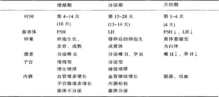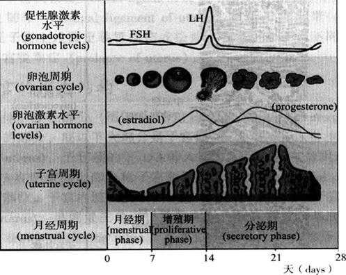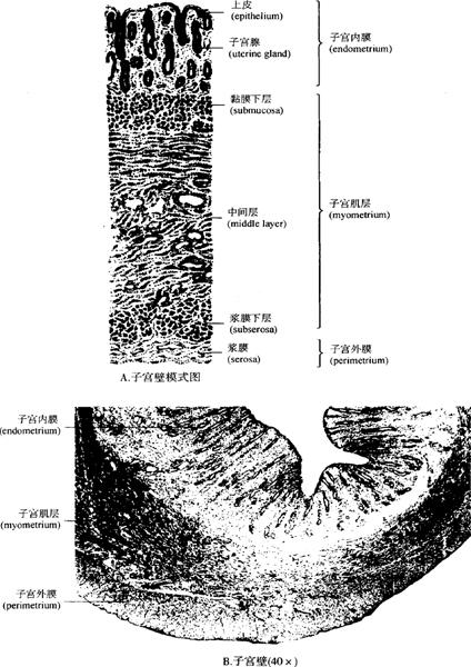 释义 | 子宫 子宫(uterus)为一中空的肌性器官,是受精卵发育成长为胎儿的场所。子宫在小骨盆内位于膀胱与直肠之间,正常呈前倾前屈位,膀胱和直肠的充盈程度可影响子宫的位置(图14-11A)。子宫后方为直肠,故临床上可经直肠检查子宫的位置和大小。维持子宫正常位置的主要装置是盆膈的承托和周围的韧带的牵引。固定子宫的韧带共有四对,分别是子宫阔韧带(broad ligament of uterus)、子宫圆韧带(round ligament of uterus)、子宫主韧带(cardinal ligament of uterus)和骶子宫韧带(sacrouterine ligament)。如果承托子宫上述固定装置损伤或松弛,容易引起子宫不同程度的子宫下垂入阴道内,称子宫脱垂症(prolapse of uterus)。 (一)子宫的形态结构 子宫分底、体、颈三部分(图14-11B)。子宫底(fundus of uterus)是两侧输卵管子宫口以上圆凸的部分,底以下大部分是子宫体(body ofuterus)。体下端呈圆柱状称子宫颈(neck of uterus),子宫颈的下1/3伸入阴道内,叫子宫颈阴道部(vaginal part of cervix),上2/3在阴道以上部分称子宫颈阴道上部(supravaginal part of cervix)。子宫颈为癌肿好发部位。子宫内腔较狭窄,分为上下两部,上部在子宫底和体内,称子宫腔(cavity ofuterus),呈倒置三角形,基底向上,尖角向下。基底的两角有输卵管子宫口(uterine orifice of uterine tube)。下部位于子宫颈内,称子宫颈管(canal of cervix of uterus)。子宫颈管呈梭形,上口为颈管内口(Internal uterine opening);下口称颈管外口(external uterine opening),即子宫口(orifice of uterus),通阴道。子宫口在未产妇为圆形,分娩后呈横裂形,裂口周围呈唇状。 (二)子宫的组织结构 子宫壁很厚,由内膜、肌层和外膜组成(图14-13A、B)。子宫内膜(endometrium)由单层柱状上皮和固有层构成,含丰富血管和子宫腺。子宫内膜可人为地分为两层,靠近子宫腔的一层较厚称功能层(functional layer),此层受卵巢激素的影响有周期性的改变与剥脱。靠近肌层的一层较薄为基底层(basal layer),当功能层脱落后由此层修补。肌层(myometrium)为很厚的平滑肌,此层具有很大的伸展性,妊娠时平滑肌细胞体积增大和增长,以适应妊娠需要,足月妊娠时子宫腔的容量,一般可增至非孕期的1000倍。分娩时,子宫平滑肌有节律收缩,成为胎儿娩出的动力,还可压迫血管,制止产后出血。子宫外膜(perimetrium)在子宫体和子宫底为浆膜,其余为纤维膜。 图14-13 子宫壁组织结构(A、B) (三)月经周期 女性从青春期开始,在整个生育年龄期间,生殖器官和子宫内膜呈现周期性变化。子宫内膜周期性增殖、分泌、脱落、出血的过程称为月经周期(menstrual cycle)。月经周期中子宫出血的现象称为月经(menstruation)。月经周期的长短因人而异,平均28天左右。一般把子宫开始出血的这天算为月经周期的第一天。青年女性,12~14岁左右出现第一次月经,称为初潮(menarche)。45~50岁的妇女月经停止称绝经(menopause)。 1.月经周期中卵巢与子宫内膜的变化 依照子宫内膜的变化,可将月经周期分为三个期(图14-14): 图14-14 月经周期形成的原理及卵巢和子宫内膜的变化 (1)增殖期(proliferative phase):此期的时间由月经停止日开始到卵巢排卵日为止,相当于月经周期的第5~14天,历时约10天左右。此期中卵泡逐渐发育、成熟,并分泌雌激素。雌激素使月经后的子宫内膜修复增生,内膜的血管和腺体增多增长,呈增殖型变化,但此时的腺体无分泌功能。在此期末卵泡成熟发生排卵(ovulation)。此期也称卵泡期(follicular phase)。 (2)分泌期(secretory phase):此期由排卵日起到月经到来之前止,相当于月经周期的第15~28天,历时14天左右。在此期内排卵后的卵泡发育成黄体。黄体分泌的孕激素和雌激素使子宫内膜显着增生,血管、腺体进一步增长,腺体分泌含糖原的黏液,呈分泌型变化。子宫内膜腺体的分泌活动是本期的特点。这个特点为受精卵的植入准备了良好的条件。此期也称黄体期(luteal phase)。 (3)月经期(menstrual phase):此期由月经来潮到月经停止,相当于月经周期的第1~4天。如卵子未受精,黄体逐渐萎缩变成白体,雌激素、孕激素分泌减少,子宫内膜失去雌激素和孕激素的支持而脱落,血管破裂出血,经血量约50~200ml。随后又进入下一次月经的增殖期,周而复始。 2.月经周期形成的原理 月经周期中,子宫内膜的变化是在卵巢激素作用下形成的,而卵巢的活动又受到下丘脑-腺垂体的控制(图14-14)。 在增殖期,下丘脑分泌的促性腺激素释放激素(GnRH),促进腺垂体产生促卵泡激素(FSH)和黄体生成素(LH),此时腺垂体主要分泌FSH,刺激卵巢内卵泡的生长发育,而卵泡分泌雌激素引起子宫内膜呈增殖型变化。当雌激素在血中的浓度增高时,促进下丘脑分泌GnRH,进而使腺垂体分泌FSH和LH,以LH为主。在FSH和大量LH的作用下,成熟的卵泡排卵,并生成黄体,继续分泌孕激素和雌激素,使子宫内膜呈分泌期的变化。如果未受孕,随着血中的雌激素和孕激素水平的升高,它们又抑制下丘脑分泌GnRH,抑制腺垂体分泌FSH和LH,血中的FSH和LH水平下降,黄体失去FSH和LH的支持,萎缩变成白体,使血中雌激素和孕激素水平急剧下降,子宫内膜失去雌激素和孕激素的支持,因而脱落、出血进入月经期。血中雌激素、孕激素水平的减少,解除了对下丘脑和腺垂体的抑制作用,FSH和LH分泌又增多,于是又进入下一个月经周期的增殖期,如此周而复始。月经周期形成的原理及卵巢和子宫内膜的变化总结于表14-1。 表14-1 月经周期形成的原理及卵巢和子宫内膜