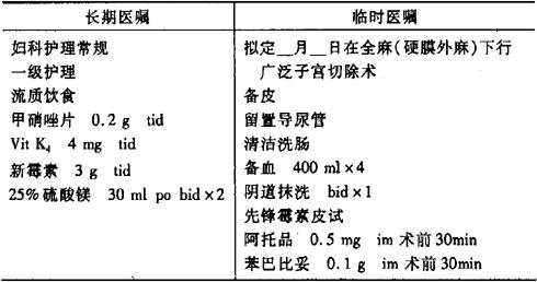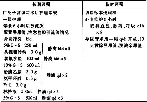 术前医嘱 手术医嘱 术后医嘱 说明:(1)一般术后6小时可改为流质。 (2)盆腔引流管根据引流物的多少情况,术后48~72小时拔除。 (3)术后导尿管留置7~10天,拔除前2天夹闭导尿管,每4小时开放1次,以训练膀胱的舒缩功能。 |