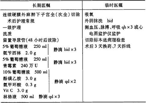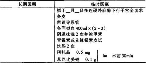 术前医嘱 说明:(1)贫血者,须输血纠正贫血,使血红蛋白升至≥90g/L。 (2)年龄大、肥胖者须检查血糖、血脂及心功能检查。 手术医嘱 说明:(1)精神紧张、睡眠欠佳者可在手术前夜予以镇静药物,让其休息好。 (2)有高血压者除应用镇静药物外,可于手术当日早晨含服硝苯地平(10mg)。 子宫肌瘤术后医嘱 说明:(1)术后第2~3天根据患者恢复情况调整医嘱,增加或减少输液量。 (2)术后3天伤口换药,7天伤口拆线。 |