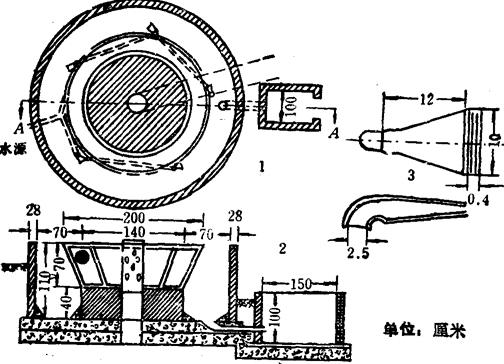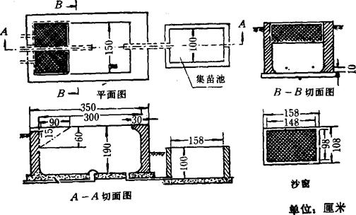 释义 | 孵化设备的建设 目前使用的孵化工具有孵化缸、孵化环道、孵化槽等三类。 (1)孵化缸 多用陶瓷缸改制而成,是一种经济简便、效果较好的孵化工具,适合小规模生产(见图2-14)。其容水量200-400公斤,可放受精卵40-100万粒。 图2-14 孵化缸 1.缸罩;2.缸体;3.缸底糊成漏斗状;4.喷水管和进水开关;5.进水管 孵化缸制作方法: ①缸体。第一步,将陶制釉缸先固定缸底,小心在缸底部中央或在底部侧面敲一小洞,插入进钢管后,用混凝土和石块将水管固定。管口用木塞塞好,勿使混凝土浆进入;第二步,隔一天,待混凝土固定后,将孵化缸倾倒,将混凝土浆放入缸内用一弧形板沿底部向缸中部做弧面,做好半面后停6小时以上,待水泥凝固,再转动缸体做另外部分;第三步,即第三日待混凝土凝固后扶正缸体,在缸内壁喷些水,表面洒匀水泥干粉用排刷光面(图2-15)。 图2-15 孵化缸体制作过程 ②缸罩。用宽2厘米的长竹片,在缸口内壁25厘米处沿缸内壁选适当位置固定缸罩下环,截去多余竹片,将竹片二端对接后沿竹片向上提拉使竹片与缸壁贴紧。 取一直杆,直插缸底中央出水管口,杆的中部保持在缸口中央位置。用一细绳,一端固定在缸内环处(下图A点)拉紧绳子,使绳子沿竹竿向上移动,选择好缸罩距缸口边缘的位置,以不与缸口接触并保持5-8厘米距离为宜,固定后选出C、B二点。C为缸罩上环位置。注意不宜太高或太低,一般距缸口20-25厘米为宜。 取下缸内环,准确量出其长度,若缸罩采用由三块筛绢拼缝,可取其内环周长的1/3长度,在以AB为半径作的圆弧上取其长度,得D、E二点,连接BD、BE二点后再以BC为半径作圆弧与线BD交点得F点,与线BE交点得G。扇面DEG下则为缸罩1/3筛绢的形状。因缸体形状各有差异,每只缸的缸罩须编号专用,上述扇面需用硬纸板做成模板,同时按样在筛绢上裁剪拼缝,上下贴布做环套穿入竹片即成缸罩。模板用后应妥为保存,以备再用(图2-16)。 图2-16 孵化缸缸罩制作简图 (2)孵化环道 孵化环道多为水泥砖块砌成的大型孵化设备,有圆形和椭圆形两种。圆形孵化环道较普遍,又分为单环、双环和三环三种结构,一般直径6-10米,每立方米放卵70-80万粒,多的可放120-130万粒。 孵化环道包括进水系统、环道、排水系统、过滤纱窗和收苗池五部分,见图2-17。 图2-17 孵化环道(单位:厘米) 1.平面图;2.A-A切面图;3.喷嘴 ①进水系统包括水塔(或蓄水池)、进水管道与出水喷咀、过滤装置。 水塔(或蓄水池)应建在距水源较近的地方,地平位置应为较高的地方,水源的进水管处应设过滤装置,过滤面积要大,滤网采用GG、60-70目的尼龙筛绢或绸丝网布,防止剑水蚤等有害生物进入孵化器内。 进水管道指自水塔或蓄水池进入孵化环道的管道。设计时应认真计算。总进水管道的截面积要比各环道出水喷头的总截面积增加1/4左右。如果孵化环道为双环或三环的,各环应分别设立进水管道,每条管道都要设立控制阀门,控制水流。进水管上接若干喷水管(数量应计算使环道内无死角为原则)管径为3.8厘米左右(注意不宜太小,以保证在一定流量的情况下流速不太大),喷水管管口位于环道底部,出水口是一只用白铁皮做成的鸭嘴形喷嘴,喷水嘴位于池底中线处约高5厘米处,两只喷水嘴相距约1米左右,喷水嘴沿环道内壁切线方向喷水。 ③环道。宽度为80-100厘米,高80-90厘米,水深保持70-80厘米。内壁要光滑,底部呈“∪”型,环道底部设一出苗孔,位置要较低些。出苗孔有管道与出苗池相通,出口有阀门控制。 ③过滤纱窗。面积越大,鱼苗及鱼卵越不易贴附在纱窗上,孵化效果就越好。一般要求孵化环道内的每立方米水容量需有效过滤纱窗面积最好不少于0.1平方米。 过滤纱窗的结构一般有二种: 一种是窗式结构,沿环道内壁或外壁均匀排列为若干梯形的木框,一般框长45-60厘米,宽30-40厘米,框内装有筛绢(42-45目)直立或上缘向环道内倾斜12-15厘米。每只环道过滤纱窗的只数应按上述要求计算,均匀排列在环道池壁上。 第二种是环形滤网结构,即全过滤式,在环道内壁或外壁整圈用钢筋做成一只大的纱窗圈后用筛绢围制而成。上圈与环道壁平或可稍高出下圈约距环道底30厘米左右处。 ④排水系统。排水管道截面积应大于进水管道截面积的1/3-1/2,一般系用15-20厘米的陶瓷管或用砖砌成,排水管可通向出苗池。纱窗处的溢水口距环道上缘约10厘米处,溢水口截面积应比进水管截面积大一倍以上。 ⑤收苗池一般长1.2-2米,宽1-1.5米,深0.5-1米,池底比环道底低30-45厘米。排水口应有闸门控制。 (3)孵化槽 孵化槽为长方形(图2-18),一般长3-3.5米,宽和高相同,均为1.2-1.5米,内壁光滑,底部二侧略呈弧形,并向出苗孔方向略有倾斜。槽底前后二端也呈弧形,特别是后端(近出苗池的一侧)的弧应更大些,便于带动鱼卵和鱼苗在槽内做上下环流。 图2-18 孵化槽(单位:厘米) 滤水纱窗1个,面积较大,长度应与孵化槽的宽度相适应,宽度为1米左右,斜置在前端(进水的一端)的上部,与槽内壁成20-30度夹角。 进水管在槽底,喷水管有的只有1根,开口在槽底前端正中线上;有的为3根或5根,开口分布在槽底前端两侧和中部,口上装有鸭嘴形喷嘴。 排水是经过过滤纱窗后的水,经二侧槽壁暗边与排水管相通。 出水孔在槽底末端正中,有出苗管通至收苗池。 |