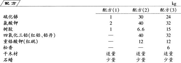 先将干木材制成火柴梗,蘸些熔化的石蜡待用。将树胶用热水溶化成胶水,再分别将配方(1)、(2)和(3)中的其余全部原料分别磨成细粉,混合均匀,然后用胶水调成3种糊状体,分别将其放在浅而宽的容器内,将备好的火柴木梗排列成行,蘸取火药糊。干燥后,即成3种不同的安全火柴。