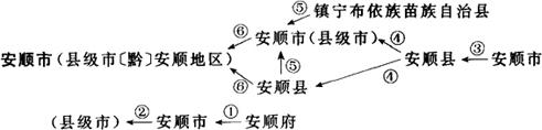 ①1912年称安顺府;1914年改为安顺县。②1958年撤销安顺县,设立安顺市(县级)。③1962年撤销安顺市,复设安顺县。④1966年以城关镇和东关、西关两公社设置安顺市(县级)。⑤1979年安顺县划4个公社,镇宁布依族苗族自治县划1个公社归安顺市管辖。⑥1990年2月3日,经国务院批准,安顺市和安顺县合并,仍称安顺市(县级)。