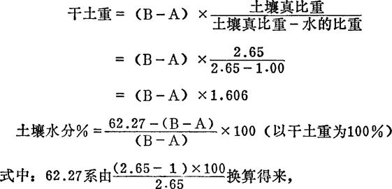 释义 | 定容称量法 本法适用于田间土壤水分的快速测定,用具简单,省略烘干除去水分等手续,利用水与土壤的真比重为已知数,以同体积水与同体积的(水+土)的重量之差,计算出干土重和水分百分数。不需要精细天平,感量为0.1的天平称量即可。无论是含水量多的水稻土或旱地土壤样品,都可快速测定。 容量为250-500ml的玻璃瓶或三角瓶,颈部标记一定刻度,盛清水至刻度,称重为A;将水倒出,加入湿土样品100g,加少量水,用玻璃棒搅拌,并予以振摇,使土中空气放出,最后添水至原刻度处,称得重量为B。若以土壤真比重平均为2.65,水的比重为1.00,则: A为第一次称得(瓶+水)的重量(g); B为第二次称得(瓶+土+水)的重量(g)。 |