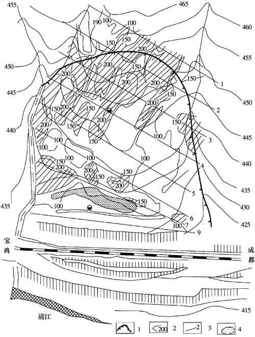 释义 | 宝成铁路塔坝滑坡放射性调查 宝成铁路四川塔坝滑坡面积约500×200m2,为规模较大的堆积层老滑坡区,覆盖层厚15~20m,基岩中砾岩、砂岩破碎,页岩、泥灰岩风化严重,裂隙密集,地下水丰富。在地质勘查的基础上,以静电α卡测量为主,配合甚低频电法,测线方向与导水构造方向近于垂直,线距20~25m,点距5~10m。地形向南西方向倾斜。静电α卡测量等值线图,如图2-8所示。大于150脉冲/5min的高值异常汇聚在滑坡的前缘,圈定了滑坡范围。该异常带集中在南北向断层破碎带的西侧边缘,该带裂隙被泥质物充填,地下水至此转向北径流。用甚低频对比验证,两者接近于吻合。测线上钻孔资料证明,地表覆盖层厚16m,主要为砂质粘土的碎石。以上说明静电α卡测量滑坡效果良好,反应了滑坡界面和地下水分布,为排水整治滑坡工程提供了设计依据(金培杰等,1992)。 图2-8 宝成铁路塔坝滑坡静电α卡测量等值线图 1-滑坡范围;2-静电α卡等值线图;3-静电α卡测线;4-湿地 【参考文献】: 邓清禄.2000.斜坡变形构造.武汉:中国地质大学出版社 段永侯,罗元华,柳源等.1993.中国地质灾害.北京:中国建筑工业出版社 姜卫方,万明浩.2000.地质雷达在滑坡面调查中的应用及效果分析,物探与化探,24(3) 金培杰,曹玉立.1993.甚低频电磁法在确定滑坡地下水分布中的应用.物探与化探,17(2) 金培杰,曹玉立.1992.静电α卡法在探测滑坡地下水中的应用.中国地质灾害与防治学报,3(3) 李媛,张颖,钟立勋.1992.中国滑坡崩塌类型及分布图说明书.北京:中国地图出版社 李智毅,王智济,杨裕云.1996.工程地质学基础.武汉:中国地质大学出版社 李智毅,唐辉明.2000.岩土工程勘查.武汉:中国地质大学出版社 李大心.1994.探地雷达方法及其应用.北京:地质出版社 刘传正.2000.地质灾害勘查指南.北京:地质出版社 牟会宠.1987.滑坡.北京:地震出版社 牛建军,张晓培,邱慧.2000.综合物探方法在中里滑坡调查中的应用.水文地质工程地质,27(3) 孙纪荣.1989.三峡黄腊石滑坡与K剖面法电法勘探工程物探.工程物探 王谦身,张赤军,周文虎等.1995.微重力测量——理论、方法与应用.北京:科学出版社 晏同珍,杨顺安,方云.2000.滑坡学.武汉:中国地质大学出版社 张咸恭,李智毅等.1998.专门工程地质学.北京:地质出版社 地球物理地球化学勘查研究所.1983.日本工程物探译文集 |