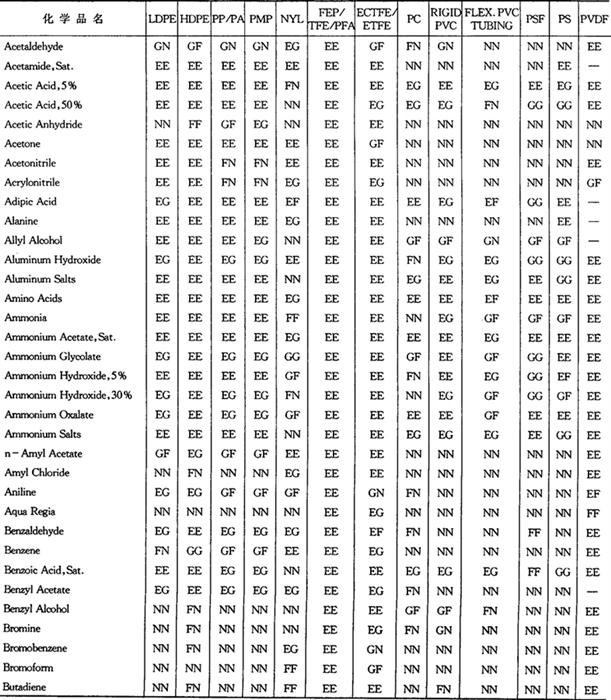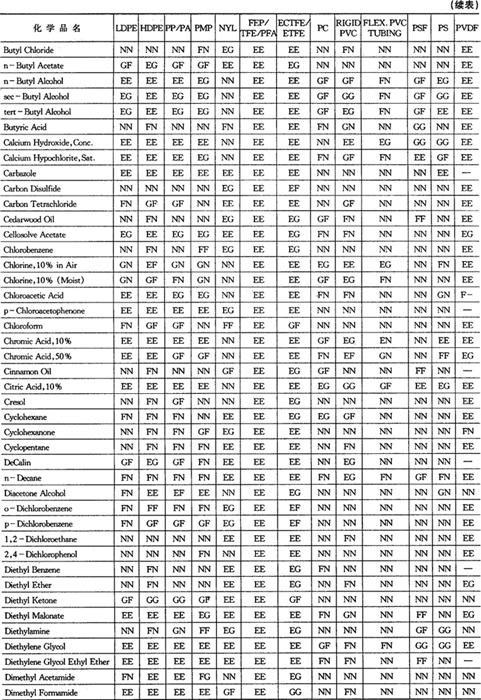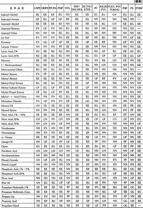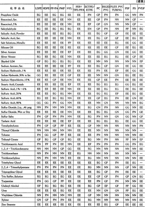 表10-3 实验室塑料抗化学品力表 (此表摘引自参考文献69) 注:*汞可渗透所列的所有树脂,未列者其化学力为EE 1.表中缩写:ECTFE Ethylene-Chlorotrifluoroethylene Copolymer ETFE Tefzel Ethylene-Tetrafluoroethylene FEP Teflon Flurinated Ethylene Propylene HDPE High-density Polyethylene LDPE Low-density Polyethylene NYL Nylon(polyamide) PA Polyallomer PC Polycarbonate PFA Teflon Perfluoroalkoxy PMP Polymethylpentene PP Polypropylene PS Polystyrene PSF Polysulfone PVC Polyvinyl Chloride PVDE Polyvinylidene Fluoride TFE Teflon Tetrafluoroethylene 2.抗化学品力分类: E:30天无损害,可耐若干年 G:30天少许损坏或无损坏 F:7天有少许影响其裂,破损,拉力减弱,退色 N:短时可损害 3.第一个字母,在20℃;第二个字母在50℃。例EG表示E在20℃时,G在50℃时。 |