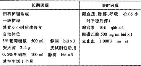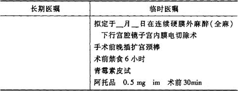术前医嘱 手术医嘱 说明:(1)宫腔镜子宫内膜电切除术一般需在麻醉状态下进行。 (2)术后一般选用较强抗生素预防感染。 (3)术中B超作为常规监视设备。 术后医嘱 说明:(1)预防性抗生素可据患者术中情况、用药史及药敏结果进行调整。 (2)术后注意阴道流血情况。 |