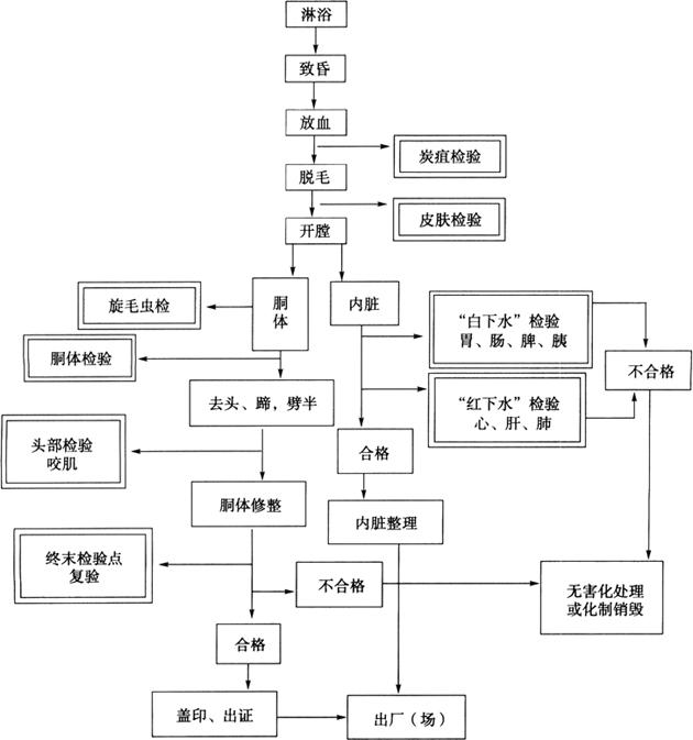 释义 | 宰后检验的组织方法和技术要求 (一)宰后兽医检验点的设置与同步检查方法 宰后检验点的设置是根据屠畜的种类,对畜产品的卫生要求及生产加工工艺和兽医检验技术条件与技术水平来设置的。在我国现有的工艺设备与技术条件下,在有自动或半自动传送装置的屠宰企业中,宰后兽医卫生检验点的设置图示如图5-1-2所示。 图5-1-2 宰后兽医卫生检验点的设置示意图 1.在有传递装置的屠宰场 猪的兽医卫生检验点的设置与牛羊有所不同。 (1)猪宰后的检验点的设置 第一检验点——炭疽检验点:一般又称为“头部检验”或“炭疽检验”。应在放血之后入烫池之前,进行剖检颌下淋巴结以检验炭疽病。 第二检验点——皮肤检验点:在煺毛之后,开膛之前检验皮肤的健康状况。 第三检验点——“白下水”检验点:在开膛之后检验胃、肠、脾、胰等脏器。 第四检验点——“红下水”检验点:开膛之后检验心、肝、肺等脏器。 第五检验点——旋毛虫检验点:开膛之后自横膈膜肌脚部取样,送旋检室进行旋检。 第六检验点——胴体检验点:在劈半之后检查胴体各主要部位的淋巴结和腰肌以及肾脏。重点检验囊虫。 第七检验点——头部检验点,重点剖检咬肌,检查猪囊虫。 第八检验点——终末检验点:也称“复检点”,上述各检验点发现的可疑病变或遇到疑难问题的,送至这里做进一步的详细检查,必要时配以实验室手段。 此外终末检验点还对胴体进行复检,以防出现漏检,同时还负有监督胴体质量评定与盖印工作的责任。 (2)牛羊宰后的检验点的设置 第一检验点——头部检验点:检验头部。 第二检验点——“白下水”检验点:胃、肠、脾、胰等。 第三检验点——“红下水”检验点:心、肝、肺等。 第四检验点——胴体检验点:检验胴体与肾脏。 第五检验点——终末检验点,同猪的终末检验相同。 2.在无传递装置的屠宰场,兽医卫检点可据屠畜种类不同分别设置 (1)猪的检验分四点 第一检验点——炭疽检验点。 第二检验点——头部和内脏检验点。 第三检验点——胴体检验点。 第四检验点——旋毛虫检验点(室)。 (2)无传送装置,牛羊分两点 第一检验点——头和内脏检验点。 第二检验点——胴体检验点。 3.屠宰加工中的胴体内脏同步对号装置 当前国际肉类加工业中,屠宰加工厂的设施和工艺的分布必须服从肉品卫生质量规定的要求,其中在猪加工车间中胴体和内脏的同步对号装置是非常重要的一个环节。我国现在也很重视这个问题。 “胴体和内脏同步对号”就是在屠宰加工中,胴体在第一轨道上行走,内脏卸下后分别放入金属盘中,在另一轨道上和胴体同步运行。目前国际上使用的内脏输送盘有两种型号:一种是老式平面输送盘,就是在一条很长的平面输送机上,装有很多长方形的金属盘,内脏卸下后放在盘上检验。另一种是较新式的悬挂式输送盘,这种盘子等距离悬挂在一条循环的自动线上。其优点是内脏检验者和胴体检验者在同一个操作平台上,胴体或内脏有问题时,双方可及时对照以进行判定的这种胴体内脏同步检验方法,我国也已试行推广,并由此推动了肉联厂的改造和兽医卫检工作。 (二)被检器官和肉尸的准备 根据病原微生物最常侵入的门户和原发性受害器官呼吸道、消化道和血液、淋巴系统以及母畜的生殖道,应作为宰后的检验的重点。所以在准备时,应尽量将这些部位暴露在外,以便于检验。 1.统一编号 为了保证检验和处理的正确性,对胴体、离体头部及内脏必须编上同一号码。编号方法有贴纸号、挂牌和变色铅笔涂写法。 这些编号法都有被摩擦掉或模糊不清的缺点,贴纸号较理想,但也会被擦掉。有些屠宰厂在检验猪的屠体时,采取倒挂开膛后头和脏器在胴体上分步检验的作业方法。在国外及国内许多肉联厂现采用胴体和脏器同步检验法。 2.头部准备 牛应在第3~4气管间切断,卸下头,使喉头、甲状腺和咽喉外侧淋巴结尽可能地留在头上,暴露或游离出舌根及舌(从下颌间隙处),剥去头皮。 马属动物主要是要暴露鼻腔(鼻中膈及鼻甲骨),不须游离舌,从第一颈椎处卸下。 猪:从颈部卸下,注意在颌下淋巴结检验未发现炭疽时方可卸下头部。 3.内脏准备 摘出内脏时,心、肝、肺应保持自然联系,胸脏器官摘出时,应保留一部分胸主动脉,脾连胃同时摘出。剥离肝、胰时要注意保留肝门淋巴结。 (三)宰后检验的方法和技术要求 1.宰后检验方法 宰后胴体和内脏的兽医卫生检验,以感官检查和剖检为主,必要时辅之以细菌学、血清学、病理学、理工化学等实验室检查。 (1)视检 用肉眼观察胴体皮肤、肌肉、胸腹膜、脂肪、骨骼、关节、天然孔及各种脏器的颜色、形态大小、组织性状等是否正常。为进一步剖检提供方向,如见到牛羊颌骨膨大,提醒你注意检查放线菌病。若视检见皮肤、黏膜、脂肪发黄则表明有黄疸的可疑,应仔细检查肝脏和造血器官,尤其是皮肤的变化,在某些疾病的诊断上更有特征性。 (2)剖检 借助解剖器械,剖开观察胴体或脏器的隐蔽部分或深层组织的变化,如淋巴结的检验,肌肉旋毛虫、囊虫及内脏的检验。 (3)触检 在于判定组织器官的弹性和软硬度。 (4)嗅检 是上述检查方法的一种必要的辅助方法。对于不显特征变化的各种局外气味和病理性气味均可用嗅觉判断出来。如农药、性气味等可通过嗅检。 2.技术要求 总的要求是要遵