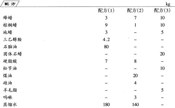 配方(1)制备 按配比将蜡和硬脂酸在夹套锅中熔化,在温度为90℃时加入三乙醇胺,再缓慢加入石脑油,使溶液保持透明。在剧烈搅拌下加入沸水,以获得良好的乳状液,然后继续慢慢搅拌,直至溶液冷却至室温即可。