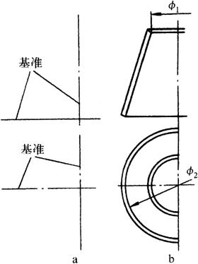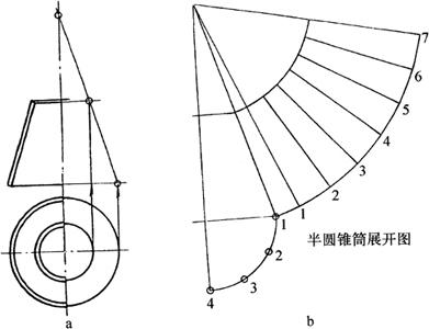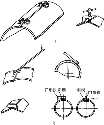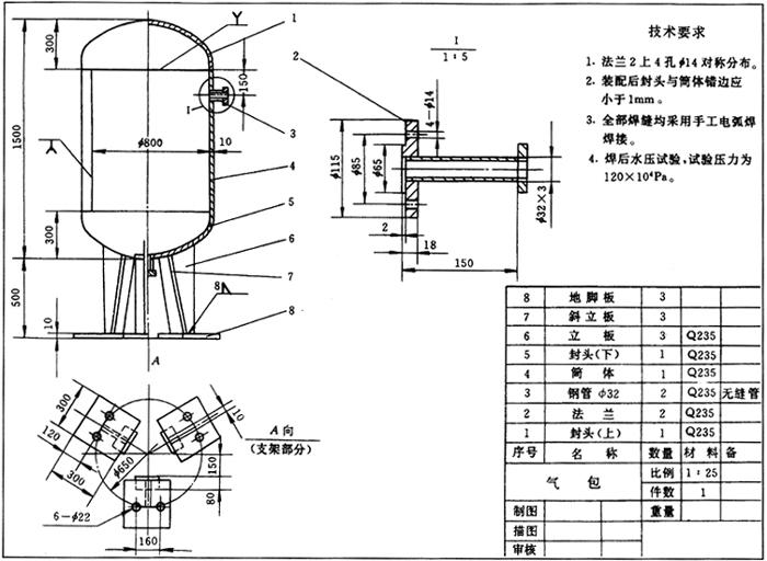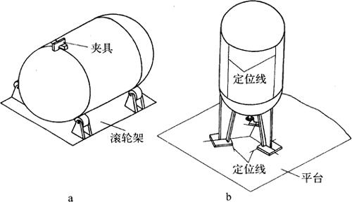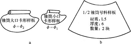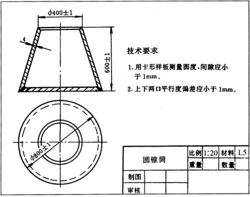 释义 | 容器类构件放样 (一)容器类构件放样工艺特点 1.展开放样 容器类构件的主体是由板材滚弯成各种形状的曲体拼焊而成,相比上述构件要求焊缝质量高、密封性能好。因此,板材下料时,为得到容器构件用料的实际形状和尺寸,须将组成容器类构件的各曲体均展开放样,展开放样是容器类构件放样的主要任务。 2.板厚处理 为保证容器类构件耐压、耐热等性能要求,一般用板材较厚,各弯曲壳体和相互间的接口,均须采用中性层法和实际结合线展开放样,才能获得其真实的形状和尺寸。因此,板厚处理正确与否直接影响构件形状、尺寸的正确性,是容器类构件放样成败的重要影响因素。 3.制作样板 容器类构件无论是外部形状还是内部结构,均比较复杂,制造工序多,工艺难度大,在放样中须制作多种类型的样板,并绘制一些草图。 (二)圆锥筒铝容器放样 图5-52所示圆锥筒铝容器是一个简单的容器构件,虽由4mm厚的L5铝板焊制成的小工件,但其尺寸精度要求较高,并要求放样时留取一定的工件锥度,以便制作弯曲胎具时参考。 图5-52 圆锥筒铝容器施工 1.线型放样 (1)确定放样画线基准:主视图以中心线和锥筒底面轮廓线为放样画线基准;俯视图以两中心线为放样画线基准(图5-53a)。 图5-53 锥筒线型放样 a.画线基准 b.工件基本线型 (2)画出工件基本线型:因工件为对称形状,可以工件对称轴为界,仅画出工件一半的基本线型即可(图5-53b)。 2.结构放样 (1)确定圆锥筒结构:将锥筒分成两半弯曲成型,再拼接成一体,两部分连接位置定在中心线处。因筒壁较薄,连接焊缝不必开坡口。 (2)制作弯曲胎具所需数据:胎具长度可取700mm,粗算胎具锥度为 (3)制作弯曲样板:锥筒弯曲加工时需要两个卡形样板(图5-54a),其中上口卡形样板直径为 图5-54 锥筒放样样板 a.卡形样板 b.号料样板 3.展开放样 (1)中性层法展开:锥筒展开时,上口展开长度、底口展开长度及锥筒高度,均以板厚中性层为基准计算,本锥筒件中心层即为板厚弯曲中性层,经处理后的放样图如图5-55a所示。 图5-55 锥筒展开放样图 a.放样图 b.展开图 (2)锥筒展开图:利用中性层法处理后得到的单线放样图,作出锥筒的展开图(图5-55b)。 (3)制作锥筒号料样板:如图5-54b所示,样板名称及相关数据全标注在图上。 4.锥筒制作工艺 (1)号料及切割下料:用锥筒号料样板在L5铝板上划好下料尺寸线,并按线准确剪切或锯切下料。然后将锥容器底圆按样图尺寸直接画在L5铝板上,按线錾切下料。 (2)弯曲成型:将切割好的板料校平,仔细清理边缘毛刺,然后在弯曲加工胎具上弯曲成型,并随时用卡形样板测量圆度。要求其间隙值应小于1mm,且上、下两口平行度偏差应小于1mm。 (3)组装及焊接:组装前先将锥筒和底圆的接头表面氧化物清理干净,再将清理干净后的锥筒纵缝点焊固定,并焊接成型。随后将底圆和锥筒组装,按照图样尺寸及公差要求,二者对接接头间隙应小于1mm,先用点焊固定,再将环缝焊接成型。 焊接时应采用氩弧焊,使用起弧板和收弧引出板,正确选择焊接工艺规范和工艺措施等(详见有关章节内容)。 (三)压缩空气储气包放样 如图5-56所示,压缩空气储气包是一个较复杂的压力容器构件,是由筒体、封头和支撑部件组合装焊而成,筒体与封头的同轴度和焊接技术要求均较高,必须严格控制筒体与封头对接环缝的间隙,确保筒体与封头的同轴度。因此,须准备放样平台及装配使用的楔条等夹具,以及装焊滚轮支架。 图5-56 压缩空气储气包施工 1.筒体放样与制作 (1)筒体展开:筒体展开后为一矩形,矩形高度在施工图样上量取,矩形长度等于筒体的周长,亦即筒体展开长度尺寸为(800+10)π。因为矩形简单易画,故可不必做号料样板,可按其尺寸直接画样号料。 (2)筒体纵缝对接:滚制成的圆筒,常会存在板边搭头、间隙过大、两板边高低不平等缺陷(图5-57)。因此,必采取如下措施: 图5-57 圆筒滚制后的缺陷 a.板边搭头 b.间隙过大 c.接边不平 d.歪扭 1)放开板边搭头:先以卡形样板测量圆筒各处曲率,找出曲率大于样板曲率处,用大锤击打其外壁,使圆筒曲率变小,直至与样板曲率相符,致使板边搭头自然放开。 有时也可用吊车按图5-58a所示方法,在适当位置将筒体吊起,靠其自重使搭接头分开,或按图5-58b所示用杠杆夹具拉开。 图5-58 放开板边搭头 a.吊开 b.拉开 2)消除间隙:在筒体纵缝两边对应处,分别焊上钻有通孔的角钢,穿入螺栓,拧上螺母(图5-59a)并逐渐旋紧,即可将板边拉紧,消除间隙过大现象。 图5-59 筒体纵缝对接矫正 a.消除间隙 b.调平接边高度 3)调平两板边高度:将杠杆夹具插在圆筒端部板缝处,压动杠杆(图5-59b),便可调压圆筒缝两板边的高度。 经上述装夹调整,确认圆筒纵缝对接处已检验和矫正合格,便可施行定位焊。 2.封头放样与制作 (1)封头展开:本工件封头为一整料压制碟形封头,是由球面和直段组成,其球面直径R≤筒体内径,直段高度为h1,球面高度为h2,封头的高度为h1+h2=300mm,封头展开后为一圆形,展开料圆直径D可根据图5-56通过计算法求得,即 式中 d——为筒体的内径(mm); h1-—可从图中按比例量取尺寸(mm)。 由于展开圆形边缘尺寸精度要求较高,故必须做号料样板。 (2)制作封头号料样板:封头在冷压或热压过程中无论采用落压成型或旋压成型,板料按胎模形状流动成型的结果,均会使封头端口被挤缩变厚,而其他部位则被拉伸变薄,造成成型后的高度较设计高度大