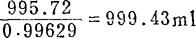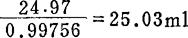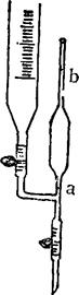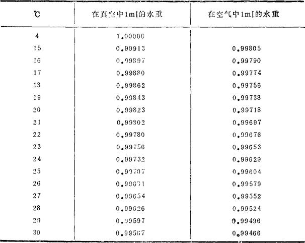 释义 | 容量器皿的使用与校准 (一)滴定管 滴定管是具有准确均匀刻度的玻管,用来测量滴定时所消耗溶液的体积。常用的有5、10、25和50ml滴定管,读数可估计至小数后两位,即液体体积可量至0.01ml。通常又可分为酸式(管的下端具有磨砂玻璃塞)及碱式(下端连接着一段橡皮管,管中有玻璃珠作为活塞)两种。酸式滴定管不能用来装碱溶液,因为碱能腐蚀玻塞以致不能转动。相反地,能与橡皮作用的物质如I2、KMnO4、AgNO3等溶液则不可装在碱式滴定管中。避光的溶液还应装在茶色的滴定管中。 读数时滴定管应垂直夹在滴定管架上,读取管中溶液弯月形的底点与刻度标线相切处。而对深色溶液,则读取弯月形上部圆圈的读数。有的乳白色条的滴定管的一侧划有蓝色垂直线,则读数应取蓝线二边水弯月形的二尖为准。 滴定管的校准:溶液的体积及器皿的容积都随温度改变而变化。所谓1L乃指在真空中1000g的纯水在密度最大时(即4℃)所占有的体积。而器皿的使用只能在室温时进行,且称量也只能在空气中进行,故必须选择一适当温度作为校准器皿的标准温度。通常以20℃作为标准。如果器皿不在20℃使用时,则必须按此标准温度加以校正,但不足10m1之容器,对于温度在20℃±4℃者,校正值并无多大影响,可以略而不计。超越此温度范围时须校正之。校正方法如下: 将需要校正的滴定管借一段橡皮管同一小的移液管相连接,如下图1-4。 图1-4 移液管校正 移液管a和b线的刻度,以称量法确定。校正时,先将滴定管和移液管充满蒸馏水,并使滴定管水弯月面与零度相切,移液管水弯月面与a线相切,然后打开弹簧夹使水恰充至b线,读取滴定管之读数。这个读数应相当于已确定的移液管的容积。按上述操作反复进行,直到滴定管的最末读数。设移液管的容量经称量法确定为4.813ml,而相应滴定管的读数为4.90,则滴定管每毫升等于 (二)移液管 移液管是用以准确地量取一定体积液体的量器,又分为带均匀刻度的玻管形(又称吸量管)和无刻度而中部膨大而下端缩小的玻管二类。后者又称移液管或大肚吸管,膨大部分标明移液管的体积和温度。在实验室常用的是1、2、5、10、20、25和50ml的二类移液管。 移液管用口吸时必须小心,切勿将液体吸入口里,因此,必须注意容器内装的液体应超过该移液管之容量,此外抽取液体时应该将移液管的尖端伸入容器底部。 对浓酸浓碱及有毒液体绝对严禁用口直接吸移。在这种情况下,可用吸水球或水压抽气筒抽取液体。 移液管之校准:将移液管洗净,吸取蒸馏水至刻度处,然后将水放入外部干燥洁净并已称量过的碘价瓶小锥瓶中,使水放完后将吸管的尖端接触到瓶壁约1分钟后,将瓶加盖,称得称瓶与水之共重。按照该温度下水的密度计算其容量。 例如:在18℃时校准25ml移液管,放出的水重为24.97g,查表可得18℃水的密度为0.99756。移液管的容量为: (三)容量瓶和量筒 容量瓶是一个具有细而长瓶颈的玻璃瓶。颈上一般刻有一个刻度(有的有二个刻度,上刻度表示倾出量,下刻度表示容量)充入液体达到这个刻度的水平时,液体的体积就相应于瓶上所表明该温度时的体积。常用的有25、50、100、250、500及1000ml的容量瓶。 容量瓶不宜加热,因为加热能使它的容积发生变化。如果内容物必须加热,应先在烧杯中进行,待冷后再移入容量瓶中定容。或可于水浴中加温至100℃以下。装碱性溶液的容量瓶,不可使用玻璃塞;而装KMnO4、AgNO3、I2液的容量瓶不可使用橡皮塞和软木塞,以免腐蚀。 量筒常有5、10、25、50、100、250、500、1000及2000ml等容积的。依其容量大小分成许多刻度,每一分度由0.1ml至10ml不等。读数时视线与液体的凹面要在同一水平线上。量筒仅作粗略地量度液体体积之用。 容量瓶的校正:洗净容量瓶内外壁,俟其干燥。然后称重,装入蒸馏水至刻度处(此时容量瓶内壁不应有水珠,若有水珠,可用滤纸吸去)然后再称重。按照水在校正温度下的密度求得其容量。 举例:一个容量瓶标明20℃容积1L,即表明此容量瓶在20℃的容积等于1000g水在4℃时所占有的体积。如在24℃使用则其校正结果如下: 设该容量瓶充水至刻度(24℃)的重为: 1136.40g 空容量瓶重: 140.58g 水重为: 1136.40-140.58=995.82g 玻璃的膨胀系数为: 0.000025 24℃水的密度为: 0.99629 故容量瓶增加的容积为: 1000×0.000025×(24-20)=0.10ml 0.1ml体积很少,可用0.1g代用计算即可。如果容量瓶并不因温度升高(20℃至24℃)而发生体积膨胀,则容量瓶在24℃时所装水之重为: 则容量瓶在20℃时的准确容积应为: 故其校正值为-0.57ml。 (四)烧杯、三角瓶和干燥器 烧杯常用的有50、100、150、200、400、600、800、1000及2000ml。实验室最常用来配制试剂;烧杯可置于铁丝网或石棉网上加热;烧杯亦可用于试验中产生沉淀以及倾倒过滤等用。由烧杯向外倾倒溶液,可藉助玻璃棒接着烧杯的嘴徐徐倒出,如此可确保溶液不损失。烧杯中溶液的搅动亦须用玻璃棒而不可采用 三角瓶有50、125、250、300及500ml的。三角瓶也可以直接在石棉网、铁丝网上加热;三角瓶可用于溶液的滴定以及接受滤液等。但三角瓶不便定量地倾出溶液,此时可用烧杯。三角瓶也不必加玻璃搅动,可紧握三角瓶颈后作水平摇动即可达使溶液均匀混合的目的。 干燥器内分上下二层,中间以带大孔的瓷板隔开。下层放干燥剂,上层放置坩埚等物。干燥剂种类很多,常用的有氯化钙、氧化钙、变色硅胶等,