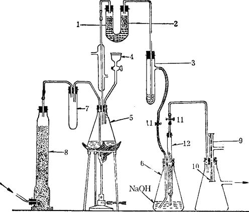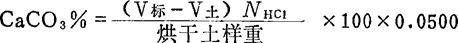 释义 | 容量法 (一)适用范围 吸收瓶中0.5NNaOH25ml,最多能吸收0.625gCaCO3放出之CO2,故称取之土样含有的CaCO3应远少于0.625g,一般若土壤CaCO3含量在5%以上者,称取土样应少于l0g。本法有较高的准确度,但其仪器装置较繁。 (二)试剂配制 1.0.25N盐酸标准溶液; 2.0.5N氢氧化钠标准溶液; 3.含氯化亚锡的1N盐酸溶液:吸取8.6ml浓HCl加蒸馏水至100ml,并溶解5gSnCl2·2H2O于其中。 4.1mol BaCl2溶液:称244gBaCl2·2H2O溶于1L无CO2的蒸馏水中,并调节至酚酞中性。 5.1%酚酞指示剂:1.0g酚酞溶于100ml 60%乙醇中。 6.0.04%溴百里酚蓝指示剂,0.04%酒精溶液。 其他有:浓H2SO4,Ag2SO4饱和溶液,碱石灰或40%KOH,甘油。 (三)仪器装置 如图14-7。 图14-7中样品瓶为200ml三角瓶,U形管底部装玻璃珠,两边各放一层玻璃棉,两臂内均装过20筛孔的浮石,左臂者用浓Ag2SO4饱和,右臂者用新煮过的浓H2SO4饱和。溴百里酚蓝指示液仅供指示装置系统内有无CO2之用,内装1ml0.04%溴百里酚蓝及10ml水。吸收柱内装直径为4-6mm的玻璃珠。柱与皮塞接触处可用少量甘油润滑,以便调节柱的高度。碱石灰塔也可用装浓KOH的洗气瓶代替以防空气中CO2侵入。 (四)测定步骤 称取通过0.5mm筛孔的风干上样10g(CaCO3含量在5%以上者可酌量少取),放入样品瓶按本书图14-7所示关系装置成一测定系统,检查全系统是否漏气。用抽气龙头慢慢地抽吸,让空气从进气口进入,通过碱石灰塔的吸收去除CO2,至溴百里酚蓝指示液由黄变蓝为止,此时表示系统内已无CO2存在。然后将开关K1及K2关紧,打开吸收瓶塞,准确吸取25.00ml0.5N NaOH,注入吸收瓶中,并加入25ml无CO2的水。调节吸收柱的高度,使抽气时柱内液面恰好上升到玻璃珠上端为度。打开开关K1及K2继续抽气,保持一定的气流速率,使通过吸收瓶内NaOH的汽泡每秒约有3-5个。由分液漏斗慢慢地加入1NHCl(含有SnCl2)约50ml。开放冷凝器的流水,用小火慢慢加热样品瓶至土液沸腾,如此继续抽气和沸腾,至溴百里酚蓝山黄变蓝为止(约30min)。然后打开吸收瓶上的塞子,再打开吸收柱上的塞子,关闭抽气唧门。用无CO2的水向淋洗柱内注洗5次,再洗柱外和进气管内外,共用水约100ml。加入1mol BaCl215ml以沉淀碳酸盐,再加2滴酚酞指示剂,立即塞好瓶子,防止CO2侵入。过量的NaOH用0.25NHCl标准溶液回滴。记录所用HCl的毫升数为V土,其当量浓度为NHcl。另作空白标定,操作完全同上,但不用土样,求得HCl的毫升数为V标。 图14-7 二氧化碳的测定装置 1.Ag2SO4浮石 2.浓H2SO4浮石 3.溴百里酚蓝指示剂 4.储酸器 5.样品瓶 6.CO2吸收瓶 7.阱 8.碱石灰塔 9.具弹性的管子 l0.抽气调节阀 11.胶管夹 12.吸收柱 (五)结果计算 式中:0.05——碳酸钙每毫克当量的克数。 |