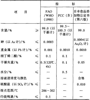 释义 | 富马酸 别名 延胡索酸、反丁烯二酸 编码 GB 01.110;INS 297;FEMA 2488 化学结构 C4H4O4 相对分子质量 116.07 性状 白色颗粒或结晶性粉末,无臭,有特殊酸味,酸味强,约为柠檬酸的1.5倍。相对密度1.635(20℃),熔点287℃,沸点290℃。200℃以上升华,加热至230℃时失水而成顺丁烯二酸酐,与水共煮生成DL-苹果酸。可溶于乙醇,微溶于水和乙醚,难溶于氯仿,pK1303,pK24.44。3%水溶液的pH为2.0~2.5。 制法 (1)由糖类经根霉发酵制得。 (2)由顺丁烯二酸异构化制得。 质量标准 鉴别方法 (1)本品加热可升华。 (2)将本品于105℃干燥3h,熔点为287~302℃(在密封管中,分解)。 (3)0.5g本品加水10mL,煮沸,溶解,趁热加入溴试液(溴饱和溶液)2~3滴,溴液颜色消失。 (4)将本品50mg置试管内,加间苯二酚2~3mg和硫酸1mL,摇匀,于120~130℃加热5h,冷却后加水配成5mL,边冷却溶液边滴加氢氧化钠溶液(2+5)使呈碱性,再加水稀释至10mL,在紫外灯下发绿蓝色荧光。 毒理学依据 1.LD50 大鼠口服10700mg/kg(bw)。 2.GRAS FDA-21CFR 172.350。 3.ADI 无需规定(FAO/WHO,1994)。 4.代谢 为三羧酸循环的中间体,参与机体正常代谢。 使用 酸度调节剂、酸化剂、抗氧化助剂、腌制促进剂、香料。 1.使用注意事项 (1)本品有强缓冲作用,以保持水溶液在pH3.0左右,并对抑菌、防腐有重要作用。 (2)本品有涩味,是酸味最强化的固体酸之一。因其在水中的溶解度低,应用较少。但其吸水率低,有助于延长粉末制品等的保存期。 (3)本品成为富马酸钠后,水溶性及风味均更好。 2.使用范围及使用量 (1)我国《食品添加剂使用卫生标准》(GB2760-1996)规定:用于碳酸饮料,最大使用量为0.3g/kg;果汁饮料、生面湿制品,0.6g/kg。 (2)实际使用参考: ①用于面条、面包、馒头,在和面时加入,其用量,面条为3g/kg;面包、馒头约1g/kg。 ②用于果酱和果冻,最大用量3g/kg。单独或与酒石酸及其盐类合用,使pH保持2.8~3.5。 ③用于清凉饮料、冷饮、浓缩果汁、水果罐头(桃、橘)等,多与其他有机酸合用。与柠檬酸合用时,其用量为柠檬酸的20%~30%。 ④用于配制酒及腌菜为2~5g/kg(与琥珀酸合用)。 ⑤本品用作固体饮料产气剂的酸性物质时,产品气泡持久、细腻。 |