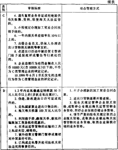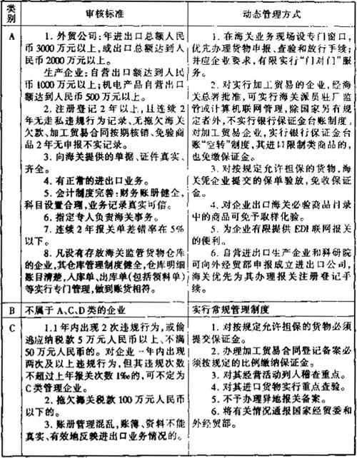 释义 | 对进出口企业的分类管理 《海关对企业分类管理办法》所称之企业是指与进出口活动有关的企业、单位、包括外商投资企业、外贸公司、有进出口权的商业物资企业、自营进出口生产企业和科研院所、加工贸易经营单位和接受委托加工企业、经营保税仓储业务的企业、从事报关业务的企业、承接海关监管货物运输的企业、设有存放海关监管货物仓库的企业、免税外汇商品经营单位及海关总署规定的从事与进出口活动直接有关的其他企业。 一、审核标准和管理方式 海关对根据企业的经营管理状况、报关情况遵守海关法律法规情况等,设置A、B、C、D四个管理类别,对企业实施动态的分类管理。其审核标准和管理方式如下: 表5-1 二、企业申请实施A类管理的程序 企业向海关申请实施A类管理时应当向主管海关提交书面申请报告,企业申请时有弄虚作假或所呈不实者,海关2年内不受理对其实施A类管理的申请,企业提交申请报告应随附下列文件一式二份: (一)外经贸主管部门或其他主管部门批准经营的有效文件的副本或复印件。 (二)企业年审合格证明。 (三)企业对照A类审核标准进行自我评估的报告。 (四)经本企业法定代表人或其授权代表牵制并加盖公章的《企业状况调查表》。 (五)企业注册所在地外经贸主管部门出具的书面意见。 海关应严格审核企业提交的有关文件和档案资料,根据企业实际通关情况进行审定,符合条件的予以核准,并在30日内通知企业。 |