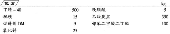 混炼时,先将丁腈-40生胶投入炼胶机进行薄通压合,待生胶均匀包辊后,加入促进剂DM和氧化锌,混合均匀。然后逐渐投入乙炔炭黑以及增塑剂邻苯二甲酸二丁酯,使其混合均匀后,加入硫磺。混合均匀后,再薄通,下片,硫化,即为成品。