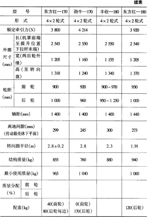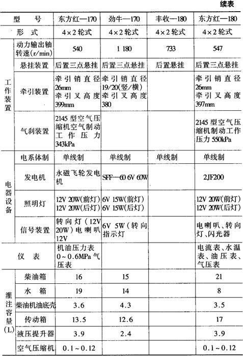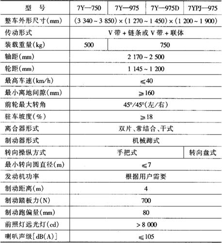 释义 | 小型拖拉机及三轮农用运输车的技术规格 (一)小型拖拉机技术规格 小型拖拉机技术规格见表3-1。 表3-1 小型拖拉机技术规格 (二)三轮农用运输车技术规格 三轮农用运输车主要技术规格见表3-2。 表3-2 三轮农用运输车主要技术规格 注:1.柴油机型号及技术参数见相应车型配套的柴油机使用说明书。 2.由于货厢结构尺寸不同,整车外形尺寸将有所不同。 3.由于车型结构的不断改进,本表所列参数可能与实物不尽相符。 4.7Y-975D型为液压自卸三轮农用运输车,其自卸部分的主要参数见7Y975D自卸装置使用说明书。 |
