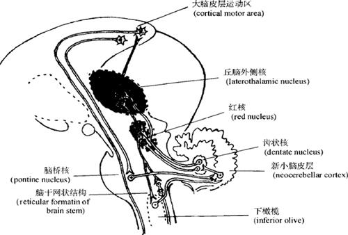 释义 | 小脑对躯体运动的调节 小脑(cerebellum)是躯体运动调节的重要中枢之一。它同大脑皮质(cerebral cortex)、丘脑(视丘)(thalamus)、脑干网状结构(reticular formation of brain stem)、红核(red nucleus)、前庭神经核(vistibular nucleus)以及脊髓(spinal cord)等保持着广泛的联系,在维持身体的平衡、调节肌紧张和协调随意运动等方面具有重要作用。 (一)维持身体平衡 实验证明,切除或破坏古(原)小脑(archicerebellum)动物会出现平衡失调。在临床观察也可见到,当肿瘤压迫或损伤古(原)小脑的绒球小结叶(flocculonodular lobe)时,患者可因平衡失调而站立不稳,但随意运动仍能得到协调。绒球小结叶与前庭器官和前庭核有纤维联系,共同维持躯体的平衡(图12-35B、图12-109)。 图12-109 小脑分区示意图 (二)调节肌紧张 旧小脑(paleocerebellum)、小脑前叶(anteriorlobe of cerebellum)对肌紧张的调节包括易化(facilitation)和抑制(inhibition)双重作用。这两种作用分别通过脑干网状结构的易化区(facilitatory area)和抑制区(inhibitory area)来实现的,但抑制作用也可能通过小脑前叶直接抑制前庭外侧核(lateral vistibulary nucleus)而发生。 小脑前叶对肌紧张调节的双重作用可随动物进化程度而不同,进化程度越高,易化作用越明显。因此,在人类小脑损伤后引起肌紧张降低而出现肌无力症状。这种症状往往表现为同侧肌紧张降低。 (三)协调随意运动 小脑协调躯体的随意运动是由新小脑(neocerebellum)来完成的。新小脑与大脑皮质存在着双向性联系,形成大脑与小脑之间的反馈联系(feedback connection)。这一反馈联系对大脑皮质发动随意运动具有重要的调节作用,使大脑皮质运动区(motor area)发出的信息能及时调整,从而及时纠正误差,以保证躯体运动的协调、准确和稳定(图12-110)。 图12-110 新小脑的神经纤维联系示意图 新小脑(neocerebellum)主要指小脑半球。临床上小脑半球损伤的患者,往往在随意运动的力量、速度、方向以及稳定性等方面均较正常人为差。患者出现指物不准、走路摇摆,动作矫枉过正,不能做迅速交替的运动等症状称为共济失调(cerebellar ataxia)。同时患者还可出现肌肉震颤、肌张力减退和肌无力等症状。 |