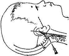 释义 | 小脑延髓池穿刺 适用于椎管阻塞、角弓反张等病儿,但因有损伤生命中枢而引起突然死亡的危险,故应慎用。准备物品同腰椎穿刺。 一、约束病儿,剃去枕部和后颈部毛发。 二、病儿侧卧,将头向前弯,使其枕部与脊椎在同一水平,必要时可在头部垫一个小枕头。 三、局部消毒,穿刺者戴手套,铺洞巾,以左手拇指固定枕骨下凹陷处,右手持斜面较短的穿刺针,在枕骨下缘凹陷处正中线上,对正病几眉间线方向缓缓刺入,也可按与眼眶上嵴到外耳道连线相平行的方向轻轻刺入,如针尖触及枕骨,可退针少许,再向下方刺入,通常皮肤至小脑延髓池距离约为2~3厘米,如有阻力丧失感,则应立即停止前进,以防发生危险。 四、穿刺针每进入少许,就应将针芯拔出1次,观察有无脑脊液流出,以免刺入过深而损及延髓组织。 五、留取脑脊液,其他处理方法,同腰椎穿刺(图6)。 图6 小脑延髓池穿刺 |