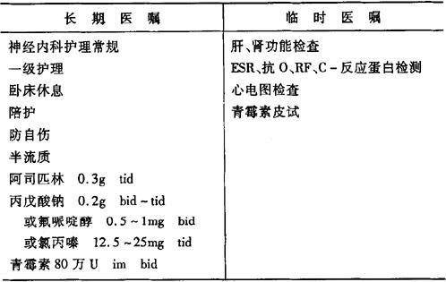 释义 | 小舞蹈病 说明:(1)舞蹈运动严重者,手足以软布约束,床边设护栏以免跌伤、撞伤,并避免光、声刺激,严重躁动不安者可临时肌内注射地西泮或氯丙嗪或氟哌啶醇。 (2)饮食要高热量、富含维生素、易消化吸收食物为主。 (3)青霉素过敏者可用红霉素或罗红霉素。 (4)药物治疗必须在舞蹈运动控制后继续数周,以防复发。 |