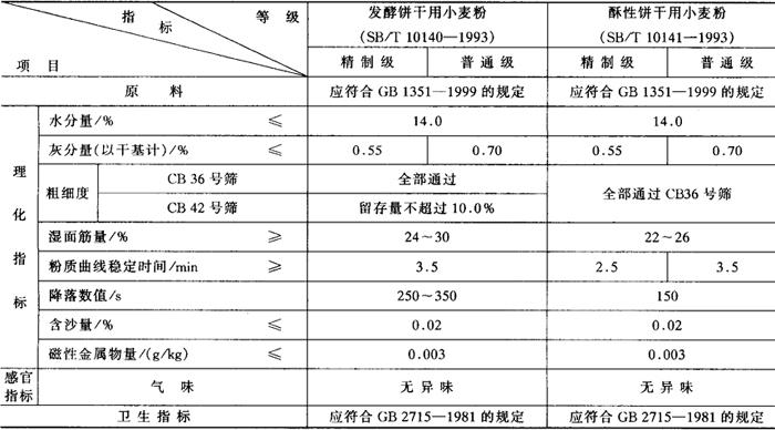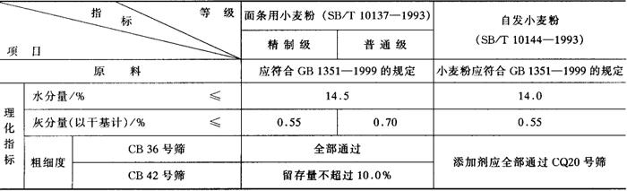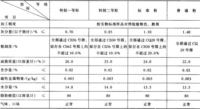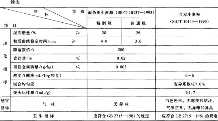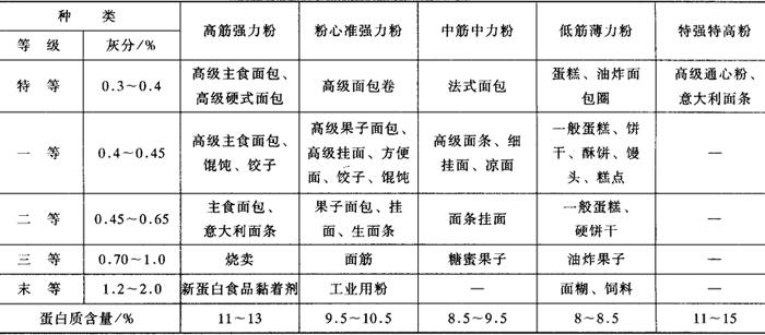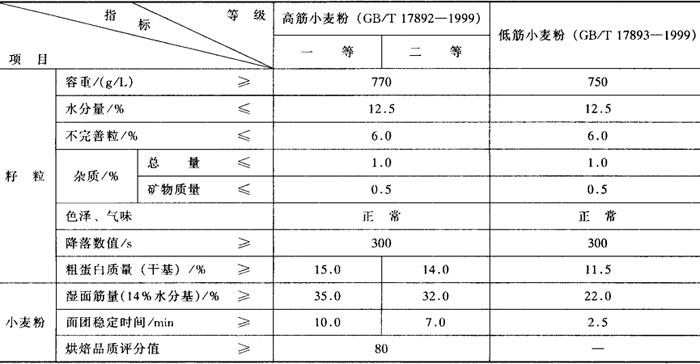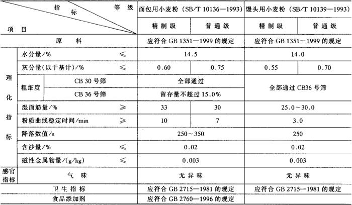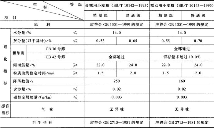 释义 | 小麦粉 (一)我国小麦粉的种类和等级标准 我国现行的面粉等级标准主要是按加工精度来分等的。国家标准中将面粉分为四等,即:特制一等粉、特制二等粉、标准粉和普通粉。 我国小麦粉的质量标准参见GB1355-1986《小麦粉》,其具体指标见表1-1-5。 表1-1-5 我国小麦粉的质量标准(GB1355-1986) 评定面粉质量的项目包括:水分、灰分、粉色、麸屑、粗细度、含沙量、磁性金属物、面筋质、气味口味、脂肪酸值等。 其中灰分和粉色主要反映面粉的精度,即面粉含麸屑的多少;而含沙量和磁性金属物反映外来无机杂质含量的多少;气味、口味、脂肪酸值反映面粉有无变质,均为面粉纯度的指标。 特制一等粉、特制二等粉和标准粉的加工精度,均以国家制定的标准样品为准。普通粉的加工精度标准样品,则由省、自治区、直辖市制定。 (二)我国小麦粉的卫生标准 我国小麦粉的卫生指标应符合GB2715-1981《粮食卫生标准》的规定和其他相关标准。粮食的卫生指标详见表1-1-6。 表1-1-6 粮食卫生指标 在小麦粉中使用的食品添加剂也应符合GB2760-1996《食品添加剂使用卫生标准》的规定。进口小麦粉的植物检疫,按照国家有关规定执行。 (三)食品专用小麦粉 食品专用小麦粉在国外已发展到20多种,主要有面包粉、饼干粉、糕点粉、面条粉及家庭粉等。我国食品专用小麦粉生产的发展速度也很快,目前已有十几个品种。 小麦粉按面粉筋力分为高筋小麦粉和低筋小麦粉;按适用食品种类分为面包粉、饺子粉、面条粉、馒头粉、饼干粉、糕点粉及家庭自发粉等。 1.高筋小麦粉(High gluten wheat flour) 高筋小麦粉应选用硬质小麦加工,用于生产面包等高面筋质食品。高筋小麦粉以面筋含量和灰分划分等级。 高筋小麦粉的质量标准参见GB/T 17892-1999《优质小麦强筋小麦》,其等级指标及其他质量指标见表1-1-7。 表1-1-7 高筋小麦粉、低筋小麦粉质量指标 检验粉色、麸屑的标准样品按照GB 1335-1986《小麦粉》中规定的实物标准样品制作。其中,一等高筋小麦粉对应特制一等小麦粉标准样品,二等高筋小麦粉对应特制二等小麦粉标准样品。 检测粗细度时,筛上剩余物在感量0.1g天平上称量不出数的,视为全部通过。 气味、口味:一般高筋小麦粉固有的综合气味和口味。 卫生指标按国家有关标准规定执行,见表1-1-6粮食卫生指标。 动植物检疫按国家有关规定执行。 2.低筋小麦粉(Low gluten wheat flour) 低筋小麦粉应选用软质小麦加工,用于生产饼干、糕点等低面筋食品。低筋小麦粉以面筋质含量和灰分划分等级。 低筋小麦粉的质量标准参见GB/T 17893-1999《优质小麦低筋小麦》,其等级指标及其他质量指标见表1-1-7。 3.各种食品专用小麦粉 专用小麦粉是指专供生产某类食品或只作某种用途的小麦粉。我国现在已有行业标准的专用小麦粉有:面包用小麦粉、面条用小麦粉、饺子用小麦粉、馒头用小麦粉、发酵饼干用小麦粉、酥性饼干用小麦粉、蛋糕用小麦粉、糕点用小麦粉、自发小麦粉等。 食品专用小麦粉按质量标准分为两等,一等是精制级专用粉,其各项质量标准较高,与国外专用粉质量相近;二等是普通级专用粉,适合于我国当前小麦品质状况,可以基本上满足焙烤食品工业产品加工的要求。 各种食品专用小麦粉的袋装、散装产品保质期均不低于3个月。袋装产品应存放在清洁、干燥、无污染的仓库中,散装产品应存放在散装袋中。 (1)面包用小麦粉 面包专用小麦粉是以小麦为原料制成的制作主食面包和花色面包专用的小麦粉,其质量标准参见SB/T 10136-1993《面包用小麦粉》。 面包用小麦粉的技术要求见表1-1-8。 表1-1-8 面包用小麦粉和馒头用小麦粉的技术要求 (2)馒头用小麦粉 馒头用小麦粉是制作馒头及包子、花卷专用的小麦粉,其质量标准参见SB/T10139-1993《馒头用小麦粉》。 馒头用小麦粉的技术要求见表1-1-8。 (3)发酵饼干用小麦粉 发酵饼干用小麦粉是制作发酵饼干专用的小麦粉,其质量标准参见SB/T 10140-1993《发酵饼干用小麦粉》。 发酵饼干用小麦粉的技术要求见表1-1-9。 表1-1-9 发酵饼干用小麦粉和酥性饼干用小麦粉的技术要求 注:检测粗细度时,筛上剩余物在感量0.1g天平上称量不出数,视为全部通过。 (4)酥性饼干用小麦粉 酥性饼干用小麦粉是制作酥性饼干专用的小麦粉,其质量标准参见SB/T10141-1993《酥性饼干用小麦粉》。 酥性饼干用小麦粉的技术要求见表1-1-9。 (5)蛋糕用小麦粉 蛋糕专用小麦粉是以软质小麦为原料制成的制作蛋糕用的小麦粉,其质量标准参见SB/T 10142-1993《蛋糕用小麦粉》。 蛋糕用小麦粉的技术要求见表1-1-10。 表1-1-10 蛋糕用小麦粉和糕点用小麦粉的技术要求 (6)糕点用小麦粉 糕点用小麦粉是以软质小麦为原料制成的制作酥类糕点专用的小麦粉,其质量标准参见SB/T 10143-1993《糕点用小麦粉》。 糕点用小麦粉的技术要求见表1-1-10。 (7)面条用小麦粉 面条用小麦粉是以小麦为原料制成的制作面条和挂面专用的小麦粉,其质量标准参见SB/T 10137-1993《面条用小麦粉》。 面条用小麦粉的技术要求见表1-1-11。 表1-1-11 面条用小麦粉和自发小麦粉的技术要求 (8)自发小麦粉 自发小麦粉是一种以小麦粉为原料,添加食用膨松剂,不需发酵便可制作馒头以及蛋糕等膨松食品。自发小麦粉的质量标准参见SB/T 10144-1993《自发小麦粉》,其技术要求见表1-1-11。 (四)香港面粉的等级