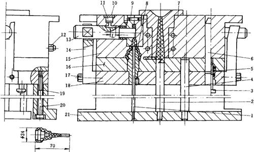 1—顶杆 2—钩料杆 3—限位钉 4—回程杆 5—弹簧 6—动模导柱 7—注口套 8—型芯 9—小哈夫镶件 10—弹簧 11—顶销 12—水嘴 13—侧型芯 14—拉板 15—定模 16—动模推板 17—螺钉 18—垫板 19—支腿 20—内六角螺钉 21—顶杆