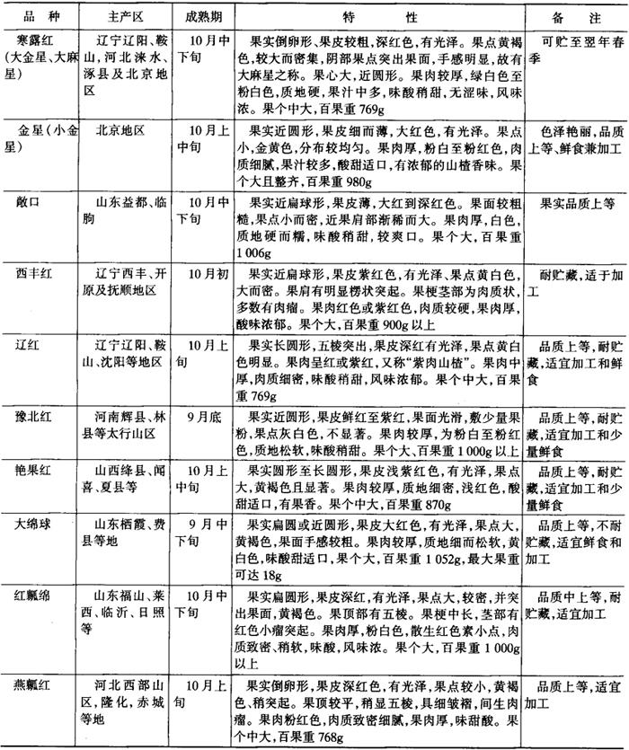 山楂属蔷薇科山楂属植物,分布在北半球,亚洲、欧洲、美洲,有1000多种,其中以北美洲的种类最多。我国有17种,按山楂树的性状可分为栽培种和非栽培种两类,北起黑龙江,南至云南、广东均有不同种类。在华北以山楂和山里红最为普遍。华中地区的湖北和西南地区的云南也有不少山楂优良品种。按果肉颜色分,山楂有紫肉、粉肉、绿肉3个品系,常见山楂优良品种及特性见表1-2-3。