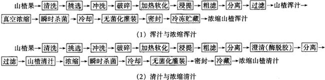 释义 | 山楂汁 (一)山楂的营养成分与加工特性 山楂别名红果、山里红,不仅是加工的良好原料,而且果实中含有多种营养成分,也是深受人们喜爱的保健食品。山楂品种不同,营养成分也有较大差异。主要山楂品种及主要营养成分见表2-1-60。 表2-1-60 主要山楂品种及主要营养成分 山楂果实中的营养物质,其中水溶性的物质有糖、有机酸、花色素、果胶、单宁、矿物质、维生素、含氮物质和风味物质。非水溶性物质有淀粉、原果胶、纤维素、脂肪、叶绿素、含氮物质和风味物质。山楂果中的总糖6%~15%,其中葡萄糖2.44%~5.55%,果糖3.24%~ 6.30%。有机酸含量3%~5%,主要有酒石酸、柠檬酸、山楂酸、苹果酸和丁二酸。 山楂中的花色素存在于果皮和果肉中,表现为红色至紫色的色调。花色素在不同pH条件下呈现不同的颜色。例如在酸性下呈红色,中性下为黄色,碱性下又成蓝色。山楂果成熟时由于含酸量高,表现为鲜艳的红色。山楂中的花色素与所有天然色素一样,稳定性较差,一方面如上所述,pH会影响花色素的色调,光线、温度、酚酶会使花色素变色或退色。另一方面,花色素与铁、铜、锡等金属接触时也会变色,因此在山楂提汁过程中,加工设备和器具与山楂果直接接触的部位禁止使用铁、铜、锡等材料,以使提取的山楂汁保持鲜艳的红色调。 山楂果实中的单宁含量为0.15%~0.58%,单宁含量高的山楂果具有强烈的涩味,对山楂制品的风味影响较大。适量的单宁与相应的糖酸相配,能产生清凉感,可以形成山楂饮料特有的爽口风味。此外单宁的某些特性,例如单宁与多酚氧化酶作用时的褐变现象,与金属的变色反应,单宁对蛋白质的凝固作用等都会对山楂汁的提取和汁的质量产生较大影响,应引起注意。 山楂中的果胶含量高达3%~4%,在各种水果中居首位,果胶给制汁工序带来麻烦,直接影响浸提、过滤和澄清,需要使用果胶酶,或采用加热方法将果胶分解或使之凝絮去除后,才能进一步加工成澄清透明的清汁。 山楂中的维生素C的含量60mg/100g左右,高者可达90mg/100g,在果品中仅次于枣和猕猴桃。 (二)山楂汁及浓缩山楂汁生产工艺流程 与浓缩苹果汁一样,按汁中是否含有果胶,山楂汁可以分为浑汁和清汁,以这两种汁作原料加工成的浓缩汁分别称为浓缩山楂浑汁和浓缩山楂清汁。原料山楂汁和浓缩山楂汁的生产工艺流程如图2-1-41所示。 图2-1-41 浓缩山楂汁生产工艺流程图 由于山楂果实中的流汁较少,不能直接用压榨方法取汁,因此一般均采用浸提法生产山楂汁。 (三)生产要点 1.原料 用于提汁的山楂果应是充分成熟,色泽红艳的新鲜果实,果实大小不限,但要尽可能剔除病虫及腐烂的不合格山楂果。 2.清洗与破碎 用流动的净水将山楂果洗涤干净,也可用洗果机进行山楂果的清洗。清洗后经过挑选,以去除其中的草、叶等杂物,剔除不合格的山楂果。 为了加速山楂汁的提取,提高出汁率,常将山楂果压裂。压裂可以使用辊式破碎机,调节两辊轮之间的距离,使果实破裂成扁平状而不破碎。如果山楂果实大小不一,在加工量大时,最好于破碎前对果实进行大小分级,否则会使破碎程度不均,影响出汁率,或者压破大果的果核,使核中的不良成分进入浸汁中影响汁的风味。对于小规模的加工厂,一般以数量较多的中等个果实压裂为准来调节压辊之间的距离。也可以不用机械方法压裂,例如利用浸提水与山楂果的温差,将山楂果表皮爆裂,使果实中的可溶性固形物加速向浸提水中扩散。 3.加热软化 山楂果在破碎以后进行加热软化,目的在于使细胞原生质中的蛋白质凝固,形成凝块,改变原生质层的半透性,使细胞中的可溶性固形物容易向外扩散,同时使果肉软化,果胶质可溶化,降低液汁的黏度,提高出汁率。另一方面,加热还可促进色素和风味物质的溶出,使果肉内的酶失去活力,稳定果汁的浑浊度。加热温度一般为85~90℃,15~20min。 4.浸提 水浸提法是从山楂中提取可溶性固形物的最普遍采用的方法。由于浸提率与加水量、浸提温度和时间、山楂果的压裂程度等有关,因此合理选择浸提参数是很重要的。山楂果浸提时的果水重量比一般以1∶2.0~2.5为宜,浸提温度70~75℃,时间6~8h。一次浸提后,浸汁的可溶性固形物可达4.5~6.0°Bx,出汁率180%~230%。为了充分提取山楂果中的有效成分,提高浸提率,可以采用3~5次罐组式连续浸提法,或连续逆流浸提法。连续多次浸提和连续逆流浸提获得的山楂浸汁浓度高达8~10°Bx。高浓度浸汁对于生产浓缩汁是极为经济的,需要浓缩的倍数较低,节能显着,浓缩汁的质量也高。 5.澄清 在用加热浸提法浸提山楂果时,根据提取的工艺和方法,在浸汁中总会含有多少不等的悬浮物质,包括碎果肉、果皮碎屑和其他杂质,其主要成分是纤维素、半纤维素、糖苷。与果汁相比,果浆中含有较多的氧化酶和果胶酶。这些悬浮物和其他杂质必须加以去除,去除悬浮杂质的方法有粗滤和离心分离。 粗滤一般采用筛滤方法。可用不锈钢制作的平筛、回转筛或振动筛。筛网以32~60目(0.50~0.25mm孔径)为宜。小规模生产可用滤布进行粗滤。 离心分离主要用于去除山楂汁中的夹杂物、沉淀物和部分果肉等固体小颗粒。对于果肉汁来说,去除部分果肉是为了调节浑浊汁中的果肉含量,酶法澄清的果汁通过离心分离还可以提高酶澄清的效果。最常用的离心分离设备是蝶式离心分离机。 清汁生产需要脱胶,山楂汁中的