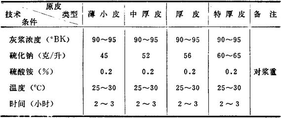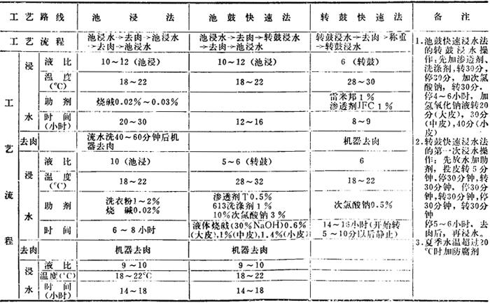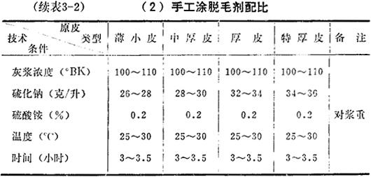 释义 | 山羊正鞋面革 1.原料皮 按不同产地,不同皮板厚薄组成生产批,分别投产。要求皮面较细,皮板较粗,纤维紧密,伤残少。 2.浸水 选用方法按表3-1进行(见84页)。 表3-1 山羊皮浸水 脱毛以后各工序分别按“甲、华北路山羊正鞋面革”或“乙、汉口路山羊正鞋面革”两种产品的工艺进行。 甲、华北路山羊正鞋面革 3.脱毛(涂灰碱法) 石灰液浓度 10°Bé 硫化钠浓度 20~28克/升 堆置时间 8~12小时 4.膨胀 液比 2~3 温度 18~22℃ 硫化钠 4.5~5.5克/升(小皮) 6~7.5克/升(大皮) 石灰液浓度 6°Bé 时间 16~20小时(间歇转动2.5~3小时) 硫化钠用量应根据季节和原皮情况控制到最小量,达到小毛基本脱净为度。 5.水洗 流水转洗,冲去石灰液。 6.修边 7.削匀 厚度要求1.8~2.2毫米(双层)。 8.称重 作以下工序用料计算依据。 9.脱灰、软化 (1)水洗 流水洗至用酚酞指示剂检查表面呈微红色为止。 (2)脱灰软化 液比 1.5~1.9 温度 34~36℃ 硫酸铵 0.4~0.5% 亚硫酸钠 0.6% 胰酶(25倍) 0.05~0.08% 转动时间 60~80分钟 浴液pH值 7.5~8.5 (3)水洗 流水洗15~20分钟,洗后控水。 10.浸酸 液比 0.4~0.6 温度 18~22℃ 盐 2.5% 转5分钟 Z2型阳离子加脂剂 1.3% 草酸 0.25%(亦可用蚁酸) 硫酸(66°Bé) 0.25~0.38% 时间 5分钟 浴液pH值 3.5~4 11.铬鞣 液比 利用浸酸液 温度 18~22℃ 30~35%碱度铬鞣液 折红矾1.5% 转10分钟 40~45%碱度铬鞣液 折红矾3% 苯二甲酸钠(相当于苯二甲酸酐0.5%) 转1.5~2小时 大苏打 2.5%(1~1.5小时加完) 小苏打 0.5~0.75%(1~1.5小时加完) 转2小时,停12~18小时,转15~20分钟,测pH值应为4左右。 12.中和 (1)流水洗15~20分钟(至水无蓝色) (2)中和 液比 1.3~1.9 温度 35~38℃ 小苏打 0.8~1.0% 转30分钟 (3)流水洗 20~30分钟 13.染色、乳液加油、填充 液比 1.5~2.5 温度 50~55℃ 扩散剂N 0.25~0.38% 染料 1~2%左右〔配比参考附录一(七)5〕 转20分钟 A-1型合成加脂剂 3~3.8% 1号鱼油皮革加脂剂 0.6~1.25% 明胶 0.6% 转动30分钟 扩散剂N 0.25% 落叶松鞣剂 1.2~1.8% 柚柑鞣剂 1.2~1.8% 转动60分钟 蚁酸 0.25% 14.水洗、降温、出鼓、搭马。 15.贴板干燥 (1)干燥至含水分45%左右,堆置过夜。 (2)干燥温度 70~85℃ 16.平展 17.晾干 18.回潮 闷水后平铺静置12~18小时。 19.拉软 20.修整 21.磨革 肉里磨净,四周边磨到,绒毛均匀。 22.扫灰尘 23.分路 按品种要求分路。 24.涂饰 (1)喷底层涂饰剂〔底层涂饰剂配比见附录一(八)4〕 (2)喷中层涂饰剂〔中层涂饰剂配比见附录一(九)4〕 底层喷二次,中层喷二次。 25.喷光亮剂 〔光亮剂配比见附录一(十)4〕 26.喷固定剂 〔固定剂配比见附录一(十一)〕 27.熨平 (1)采用平板熨平机 (2)温度 100~120℃ (3)压力 70~90公斤/厘米2 28.成品 乙、汉口路山羊正鞋面革 3.脱毛 喷(或涂)灰碱法(表3-2) 表3-2 (1)机器喷涂脱毛剂配比 4.膨胀 (1)转盐碱 液比 2 温度 24~26℃ 盐 3% 硫化钠(克/升) 3.4~3.6(大皮) 3.6~4(中皮) 3.8~4.2(小皮) 转动 第一次转90分钟,停30分钟; 第二次转30分钟,停30分钟; 第三次转30分钟,停30分钟。 (2)转新灰 液比 2~2.5 温度 18~22℃ 石灰液浓度 22~25°BK 转动 第一次转80分钟,停30分钟; 第二次转30分钟,停30分钟; 第三次转20分钟,停11~15小时。 出鼓前转动10分钟。 5.水洗 流水冲洗,洗静浮灰。 6.去肉 (在去肉机上进行) 7.称重脱灰 (1)称重 (2)水洗 流水洗20分钟。 (3)脱灰 液比 1.2~1.5 温度 27~30℃ 盐酸 1~1.5% 硫酸铵 0.3% 锯木屑 1% 转动15~30分钟 要求浴液pH值为7.5~8.5,用酚酞指示剂检查切口,中心呈一线显红。 (4)水洗 流水洗20分钟。 8.软化 液比 1~1.2 温度 33~35℃ 渗透剂JFC 0.04% 硫酸铵 0.3% 胰酶(25倍) 0.04~0.06% 1398蛋白酶制剂(1万单位/克) 0.8% 加少量锯木屑 转动 45~70分钟 要求浴液pH值8~8.5 在制品柔软光滑,有丝绸感,手指挤压后指纹清晰。 注意事项 ①软化15分钟后,测pH值,不符合要求即予调正。 ②冬季胰酶,1398蛋白酶同时加,夏季1398蛋白酶晚加30分钟。 ③软化结束后,倒去浴液,再流水洗20分钟。 9.浸酸 液比 0.8 温度 18~22℃ 盐 7% 转5分钟 硫酸(66°Bé) 0.8% 转30分钟 要求浴液pH值为2.5~3 10.铬鞣 液比 利用浸酸液 清水 50~70% 硫酸铝 0.8% 转动30分钟 测pH值应为3左右 红矾 1.2%(10倍水溶化) 转3小时 大苏打 5%(10倍水溶化,60~90分钟加完) 转3~4小时 测pH值应为4±0.1和收缩温度不低于100℃停12小时以上,转30~60分钟,出鼓堆置一天。 11.削匀 (挤水、转锯木屑、削匀) 厚度要求 0.8~1.2毫米 12.称重 13.复鞣 液比 1.4(利用废铬液) 温度 35~40℃ 38~42%碱度铬鞣液(折红矾1.4%) 转1小时 小苏打 0.42~0.56% 转1小时,停12小时以上,再转15分钟,出鼓,过下工序。 14.中和 (1)水洗 流水洗 20~30分钟 (2)中和 液比 3.9 温度 33~35℃ 小苏打 1~1.1% 转50~60分钟 (3)水洗 闷水洗2~3次,每次15~20分钟 液比 2 温度 25~30℃ 甲基红指示剂检查,切口两侧各约 15.染色、乳液加油、填充 (1)染色(黑色)液比 1 温度 55~60℃ 扩散剂N 0.14% 染料 2~3%左右〔干加,配比见附录一(七)5〕 转动时间 60分钟 (2)温水洗两次各15~20分钟 (3)乳液加油 液比 1.5 温度 55~60℃ 明胶 0.7%(水溶后加) 转10分钟 乙萘酚0.4%(等量酒精溶后加) 硫酸化蓖麻油 2.8~5.6% 软皮白油 1.4% 合成加脂剂 1.4% 转60分钟 (4)植物复鞣填充 液比 利用加油液 温度 降至30~35℃ 柚柑鞣剂 1.4% 扩散剂N 0.56% 转30分钟 (5)水洗,出鼓,搭马 16.平展、晾干 在平展机上进行至无褶皱纹印后晾干。至含水分20%以下,平铺堆置48小时以上。 17.回潮 (1)同潮后坯革含水分30~35%; (2)回潮用水的配制硫酸化蓖麻油2.5~3份,合成加脂剂2.5~3倍,加60~65℃温水至100份; (3)用喷雾器全
