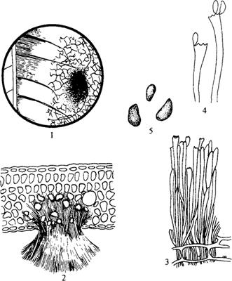 释义 | 山茶网饼病 【症状】 主要发生在已充分展开的新叶上,老叶受害少。病斑多发生在叶缘或叶尖,但叶片的其他部分也可发生。初期在叶片上产生针头大小的油渍状小点,淡绿色,以后病斑逐步扩大,呈暗褐色。病部组织变厚,有时向上反卷,叶片背面沿着叶脉出现网状突起,故称网饼病。病斑上有白色粉状物,在湿度较大时,还稍带粘性。病斑后期呈紫褐色或紫黑色。最后受害组织变褐枯死,造成落叶。 【病原】 为网状外担菌属的Exobasidium reticulatum Ito et Saw.。病斑上的网状突起为病菌的菌丝,白色粉状物即为病菌子实层。子实层上生担子及担孢子。担子圆筒形或棍棒形,顶端稍膨大,基部稍尖,大小65~135微米×3~4微米,无色,无隔膜。担子顶端生4个小梗,每个小梗上着生1个担孢子。担孢子无色,透明,单胞,倒卵形或短棍棒形,大小8~12微米×3~4微米,萌发时中间形成分隔(图9-5)。 图9-5 山茶网饼病 1.症状放大 2.病叶横切面之子实层 3.子实层放大 4.担子及担孢子 5.担孢子 【发病规律】 病菌以菌丝在植株的病叶上越冬,但不能在落叶上越冬。病菌孢子经风传播。南京地区3月下旬开始发病,全年以4~6月,9~10月间发生较重。潜育期和孢子形成期较长。在适温条件下,潜育期10~23天,孢子形成期约2个月。多次再侵染。温暖(22~27℃)、高湿、多雾、少日照、通风不良及植株生长柔嫩易于发病。 【防治方法】 引种山茶苗时,应注意检查,不要带入病株。冬季剪除病叶,减少病原。种植不宜过密,注意通风透光。病害发生期,选喷75%百菌清可湿性粉剂600倍液,或70%甲基托布津可湿性粉剂1000倍液,或1∶0.5∶160波尔多液。每隔15天左右1次。1年两次,重发病期,各喷2~3次。 |
