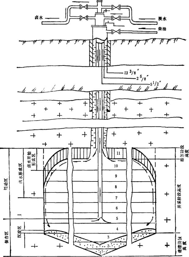 释义 | 岩盐溶腔形成特征 (一)影响岩盐溶腔形成的因素 溶腔的形成取决于水溶工艺方法、向井中注水方式、生产套管的结构、岩盐矿层的地质条件等因素。 溶空的形成对于开采率、卤水浓度、地下有用矿物的采收率和防止地表沉陷等,都有重大影响。最有利的溶腔形状是沿控制开采的盐厚(即溶腔高度)形成圆柱型。这种溶腔具有较大的溶解面积,能保证开采时获得最大的生产效率。 在生产中,如不使用油垫层,溶腔是自然地由下向上呈倒锥形发展;如使用油垫层,则溶腔接近于圆柱形,但侧壁仍不规则。溶腔的真实形状可用声纳测井仪确定。 (二)溶腔形状的分区 溶腔冲刷溶解时,可分为三部分、如图3-3-36所示。 图3-3-36 分阶段式卤井的开采溶腔分区示意图 1.活动区 溶腔顶板和举卤管下端水平面之间的区域。在盐的溶解过程中,其间出现水的运动(卤水和盐溶解活动)。 2.卤水形成区 溶腔活动区的一部分,卤水在这里达到饱和。从开采梯段形成到开采梯段结束,卤水形成区的容积不断地增大。 3.保存区 溶腔活动区以下的部分。充满着饱和卤水,底部堆积着溶解过程中沉降下来的不溶性残渣。 (三)决定水溶梯段的条件 水溶梯段是盐层厚度与水溶方法等因素的变量函数,对于控制溶腔的形成和冲刷程序具有重要的意义。确定梯段溶解高度应考虑矿区地质条件、盐层厚度、物质组分、不溶物含量、水溶工艺参数(溶腔直径、水的消耗等)等各项因素。在设计时,应注意尽可能制定有效措施,获得近似于圆柱形的溶腔,以提高开采率和取得最大可能的卤水浓度。 |