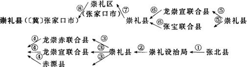 ①1912年为张北县的二个区;1934年5月析张北县二个区置崇礼设治局。②1936年改为崇礼县。③1941~1944年分别建立龙崇赤联合县、龙崇宣联合县、赤源县。④1945年恢复崇礼县建制。⑤1947年重建龙崇宣联合县、张宝联合县。⑥1949年撤销龙崇宣联合县、张宝联合县,恢复崇礼县建制。⑦1958年崇礼县并入张家口市,为张家口市崇礼区。⑧1961年析张家口市,恢复崇礼县。