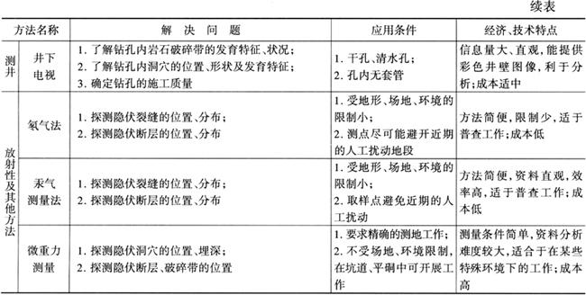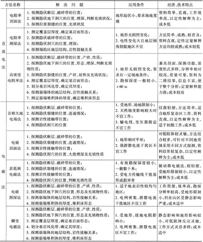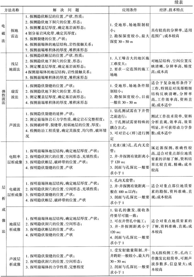 针对崩塌体勘查中需解决的主要地质问题,根据各种地球物理方法的适应性、应用条件及经济、技术特点,可选择相应方法进行勘查,见表1-2。