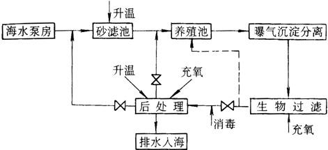 | 释义 | 工业化养鱼的类型 工业化养鱼有普通流水养鱼、温流水养鱼和循环流水养鱼三种类型。 (一)普通流水养鱼 利用自然海水经过简单处理后(如砂滤),不需加温,直接流入养鱼池中,用过的水直接排放入海的养鱼方式。这种方式设备简单、投资少,适合于南方适温地区的短期或低密度养殖,为工业化养鱼的最低级阶段。 (二)温流水养鱼 20世纪60年代初最早由日本发展起来的一种工业化养鱼方式,它利用天然热水(如温水井),电厂、核电站的温排水或人工升温海水作为养鱼水源,经简单处理后进入鱼池,用过的水不再回收利用。此种养殖方式,工艺设备简单,产量低,耗水量大,为工业化养鱼的初级阶段。目前,温流水养鱼在日本、俄罗斯、美国、德国、丹麦、法国等国较为盛行。我国近年来发展较快,如山东省胶东地区现已建有温流水养鱼厂数十家,养鱼面积约20万平方米,年产各种高档海水鱼1000吨以上,养殖种类有牙鲆、石鲽、黑鲪、六线鱼、鲷类等。这些养鱼厂的调温方式主要有三种:①燃煤锅炉升温+自然海水式,如山东省威海崮山养鱼厂、荣成寻山养鱼厂等;②电厂温排水+自然海水式,如青岛黄岛电厂养鱼厂、威海华能电厂养鱼厂等;③温水井+自然海水式,如山东省蓬莱鱼类养殖试验厂等。 (三)循环流水养鱼 又称封闭式循环流水养鱼,其主要特点是用水量少,养鱼池排出的水需要回收,经过曝气、沉淀、过滤、消毒后,根据不同养殖对象不同生长阶段的生理需求,进行调温、增氧和补充适量(1%~10%)的新鲜水(系统循环中的流失或蒸发的部分),再重新输入养鱼池中,反复循环使用(图1-20)。此系统还需附设水质监测、流速控制、自动投饵、排污等装置,并由中央控制室统一进行自动监控,是目前养鱼生产中整体性最强、自动化管理水平最高、且无系统内外环境污染的高科技养鱼系统,是工业化养鱼的最高境界,必将成为工业化养鱼的主流和发展方向。目前,世界上技术水平最高的地区是欧洲,一些国家已能输出成套的养鱼装置,如德国的施特勒马蒂克、西洛克斯、丹麦的霍尔斯摩、英国的沃特克斯养鱼装置等。中国胶东地区也已建有循环流水养鱼厂,如荣成邱家渔业公司养鱼厂,但工艺、设备、产量、效益等与发达国家相比尚存在不小差距。