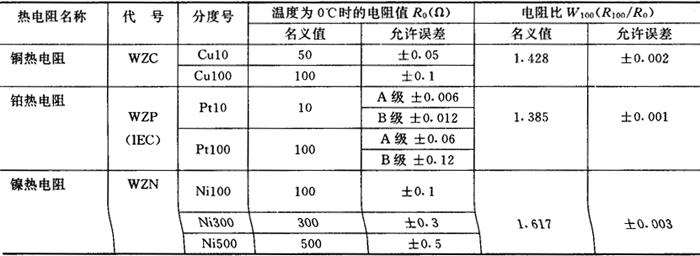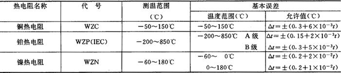 | 释义 | 工业用电阻温度计 电阻温度计准确度高,使用方便,价格便宜,因此在工业测温中应用广泛。 热电阻材料应满足下列条件: (1)电阻温度系数大、灵敏度高。 (2)在所测范围内,物理、化学性能稳定,稳定性好。 (3)电阻率大,热电阻体积小。 (4)容易制造,互换性好,易于分度。 (5)电阻与温度的关系趋于线性变化。 (6)价格便宜。 常用的电阻材料有铜、铂、镍、铁及半导体热敏电阻。其中铜、铂应用很广泛。近年来半导体热敏电阻发展较快,虽然没有统一的规格和分度表,但随着性能的提高、品种的增多和价格下降,半导体热敏电阻和其它半导体温度计的应用愈来愈广泛。 表4.5-2及表4.5-3给出现行工业热电阻的测温范围,允许误差,电阻值及电阻比的允许误差(此表待正式公布新的IEC标准后会有些变动)。 表4.5-2 工业热电阻的测温范围和允许误差