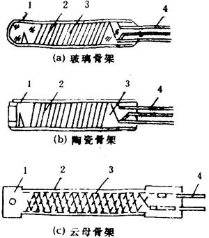 1-外壳或绝缘片;2-铂丝;3-骨架;4-引线[(a)和(b)为三线制元件] 图4.5-5 铂热电阻感温元件的几种典型结构(a)(b)(c) 其中图(a)为玻璃骨架的,一般用Φ0.04mm的铂丝先绕在玻璃棒上,然后再套上一段薄的玻璃管,用火烧结成为一长为25~40mm、直径为3.5~6mm的棒状感温元件。棒的一端露出2或3根Φ0.5mm的短引线。装配热电阻时,再加焊长引线。这种元件的特点是热惯性较小,抗震性能差、易碎。 图4.5-5(b)为陶瓷骨架的,它是在一空心陶瓷管或陶瓷棒上绕上细铂丝,然后在丝外面涂一层瓷釉经烧制而成的。其体积和特点与玻璃骨架相似,但抗震性能好些。上述两种结构的共同缺点是不易消除烧结时产生的热应力。 图4.5-5(c)所示为片状感温元件,它是以一片边上带锯齿的云母板为骨架,绕Φ0.7mm的铂丝于其上,然后在两面各加一片云母片绝缘,最后以银带绕紧而成的。 为了提高铂热电阻的抗震性和快速性,近年来出现了一种膜式铂热电阻,其中又分厚膜与薄膜两种。厚膜的是在一片25×3×1mm3陶瓷基片上,利用“印刷”的方法将其制成一个铂热电阻元件。由于条状铂膜很薄,又在基片表面上,所以热响应时间较小,约为0.1s。薄膜热电阻是利用真空镀膜的方法将膜镀在陶瓷基片上而成,其形状与厚膜的基本一样,只是尺寸更小、更灵敏。 以上几种铂热电阻的测温上限均达不到850℃,云母骨架的在500℃以下,玻璃和陶瓷骨架的最高可达550℃,厚膜和薄膜的也只有600℃。近年来还出现了一种陶瓷铂热电阻,它是利用直径为0.04mm的细铂丝先绕成两个铂丝螺旋圈,再分别放入瓷管的两个小孔中,将一头焊在起,另一头分别引出并焊上引线。为了相对固定,用高温玻璃胶将铂丝圈的一侧粘在管孔壁上,并在孔中填入氧化镁粉绝缘。这样铂丝在孔中就有了一定的自由,也有一定的抗震性。该元件的测温范围可从-200~850℃,外径可小到1.6mm,长度可小到8mm,热响应时间可达0.1s。这种陶瓷铂热电阻在国内也已经研制成功。 铜电阻温度计 图4.5-6为铜热电阻感温元件,一般用Φ0.1mm漆包线绕制而成。因为所测温度较低,所以能用漆包线做热电阻材料。又由于线表面是绝缘的,故可以重叠绕多层,而不象铂热电阻那样只能绕单层。