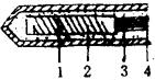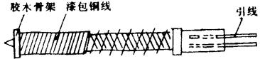 图4.5-6 铜热电阻感温元件 热电阻多用双绕法,即用两根丝平行绕,然后在顶端把两个头焊接起来,使之成为两个电流方向相反的线圈。这样其磁场方向也就相反,可使电感相互抵消,故双绕法也称无感绕法。 铠装热电阻 由于生产的需要和技术的进步,近年来铠装热电阻已经问世,其结构如图4.5-7所示。铠装热电阻的做法是将感温元件焊接到预先拉好的带保护管和绝缘材料的导线(与铠装热电偶相似)上,然后在外面焊一段短管做保护管,在感温元件与保护管之间填充满绝缘材料,最后焊上封头。