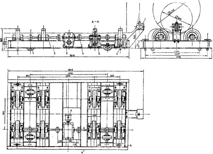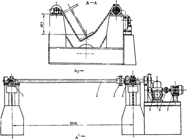 1-翻转装置 2-传动轴组件 3-刚性联轴器 4-轴承组件 5-减速器 6-弹性联轴节 7-电动机 JO2-32-4(3kW,1430r/min 载重量3000kg 焊件最大截面尺寸800mm×400mm 链条运行速度 4.7m/min)