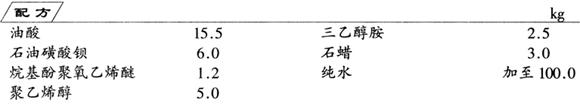 释义 | 工件防锈乳化液 制法 (1)将石蜡、油酸及石油磺酸钡等物料置于容器中,在70℃温度下不断搅拌,使物料充分互溶。然后加入三乙醇胺和烷基酚聚氧乙烯醚,继续搅拌,形成均匀黏稠物。 (2)将聚乙烯醇加入水中,于90℃下,不断搅拌,使其溶解成透明溶液。冷却至40~50℃后将此溶液在不断搅拌下,加入上述物料中,就可制得乳白色乳化液。使用时将乳液浸涂、刷涂或喷涂在工件上即可。 |
