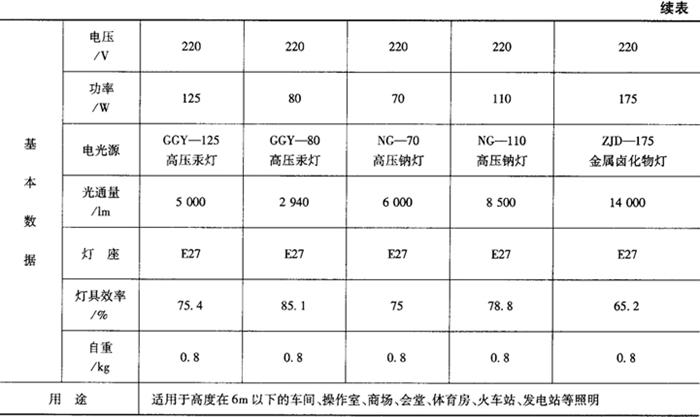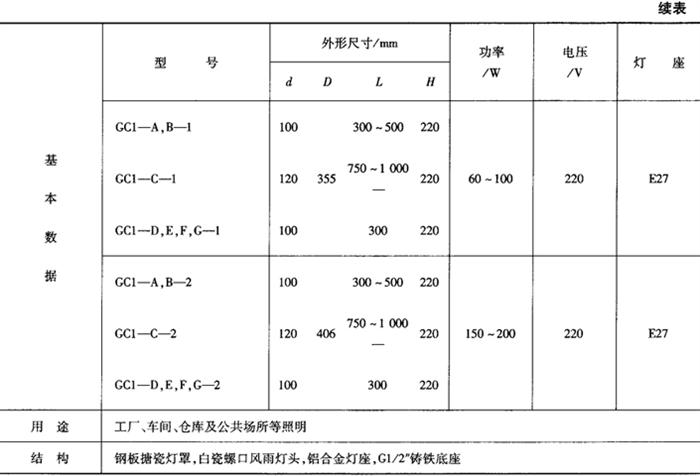工厂灯具有配照型、广照型、深照型、斜照型以及防水防尘等,其外型安装尺寸及技术数据见表9-46~表9-64。表9-46 CC1配照型工厂灯