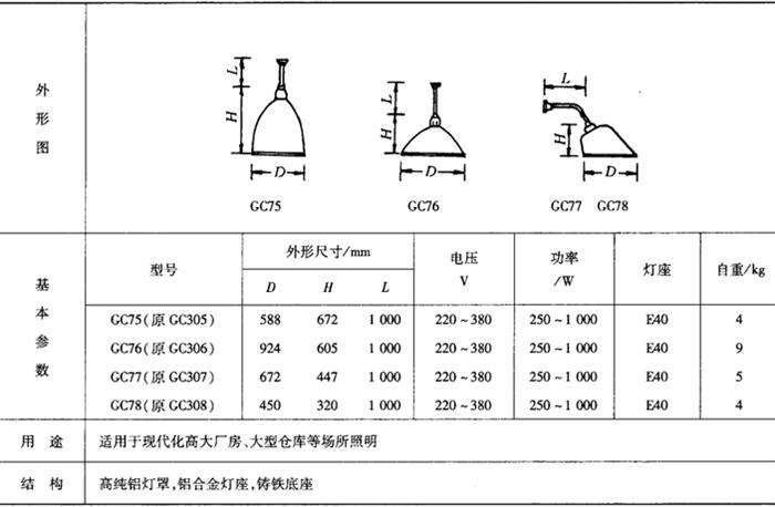 表9-60 GC75、76、77、78型高大厂房工厂灯
